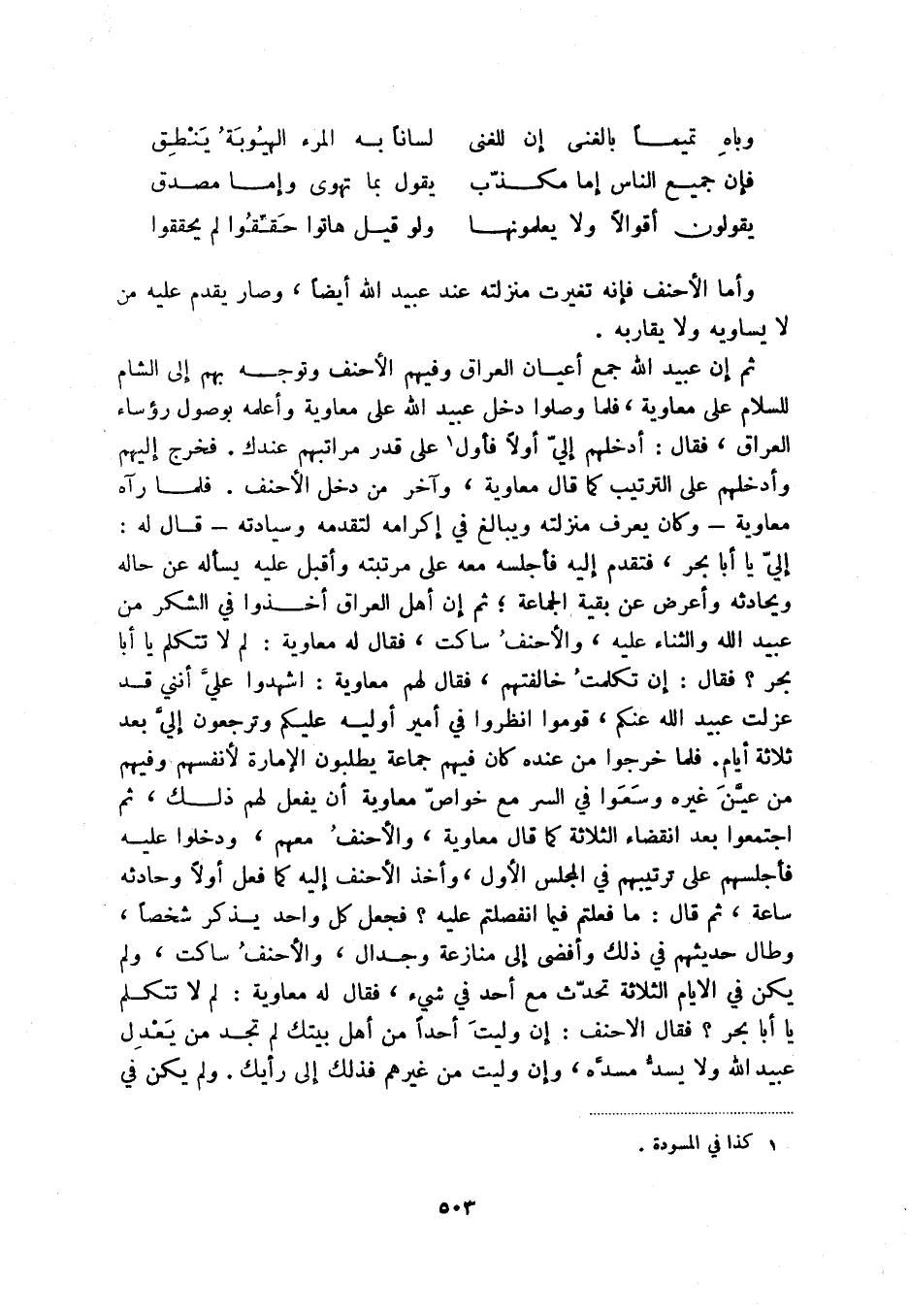 ثم إن عبيد الله جمع أعيان العراق وفيهم الأحنف وتوجه بهم إلى الشام للسلام على معاوية، فلما وصلوا دخل عبيد الله على معاوية وأعلمه بوصول رؤساء العراق، فقال: أدخلهم إلي أولاً فأول (1) على قدر مراتبهم عندك. فخرج إليهم وأدخلهم على الترتيب كما قال معاوية، وآخر من دخل الأحنف. فلما رآه معاوية - وكان يعرف منزلته ويبالغ في إكرامه لتقدمه وسيادته - قال له: إلي يا أبا بحر، فتقدم إليه فأجلسه معه على مرتبته وأقبل عليه يسأله عن حاله ويحادثه وأعرض عن بقية الجماعة؛ ثم إن أهل العراق أخذوا في الشكر من عبيد الله والثناء عليه، والأحنف ساكت، فقال له معاوية: لم لا تتكلم يا أبا بحر فقالك إن تكلمت خالفتهم، فقال لهم معاوية: اشهدوا علي أنني قد عزلت عبيد الله عنكم، قوموا انظروا في أمير أوليه عليكم وترجعون إلي بعد ثلاثة أيام. فلما خرجوا من عنده كان فيهم جماعة يطلبون الإمارة لأنفسهم وفيهم من عين غيره وسعوا في السر مع خواص معاوية أن يفعل لهم ذلك، ثم اجتمعوا بعد انقضاء الثلاثة كما قال معاوية، والأحنف معهم، ودخلوا عليه فأجلسهم على ترتيبهم في المجلس الأول، وأخذ الأحنف إليه كما فعل أولاً وحادثه ساعة، ثم قال: ما فعلتم فيما انفصلتم عليه فجعل كل واحد يذكر شخصاً، وطال حديثهم في ذلك وأفضى إلى منازعة وجدال، والأحنف ساكت، ولم يكن في الأيام الثلاثة تحدث مع أحد في شيء، فقال له معاوية: لم لا تتكلم يا أبا بحر فقال الأحنف: إن وليت أحداً من أهل بيتك لم تجد من يعدل عبيد الله ولا يسد مسده، وإن وليت من غيرهم فذلك إلى رأيك. ولم يكن في