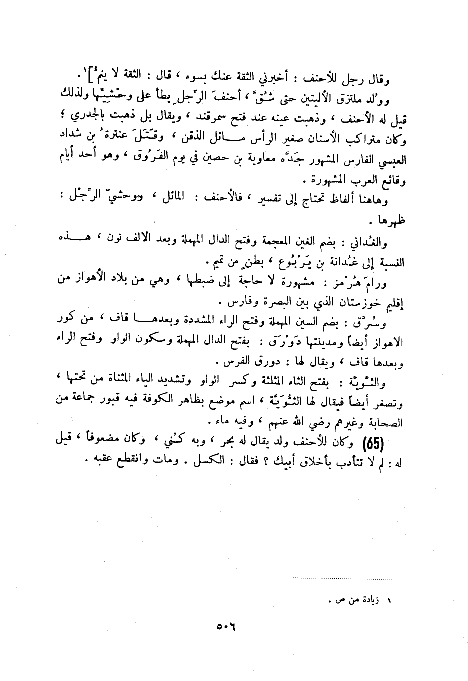 (65) وكان للأحنف ولد يقال له بحر، وبه كني، وكان مضعوفاً، قيل له: لم لا تتأدب بأخلاق أبيك فقال: الكسل. ومات وانقطع عقبه.