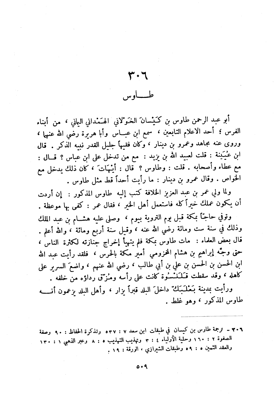 (1) ترجمة طاوس بن كيسان في طبقات ابن سعد 7: 537 وتذكرة الحفاظ: 90 وصفة الصفوة 2: 160 وحلية الأولياء 4: 3 وتهذيب التهذيب 5: 8 وعبر الذهبي 1: 130 والعقد الثمين 5: 59 وطبقات الشيرازي، الورقة: 19.