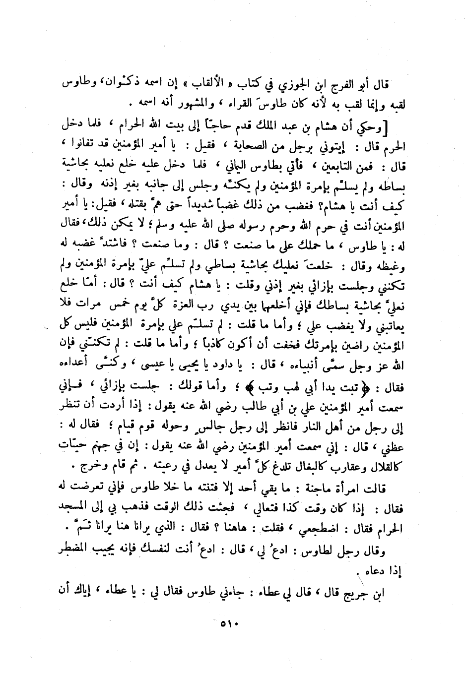 [وحكي أن هشام بن عبد الملك قدم حاجاً إلى بيت الله الحرام، فلما دخل الحرم قال: إيتوني برجل من الصحابة، فقيل: يا أمير المؤمنين قد تفانوا، قال: فمن التابعين، فأتي بطاوس اليماني، فلما دخل عليه خلع نعليه بحاشية بساطه ولم يسلم بإمرة المؤمنين ولم يكنه وجلس إلى جانبه بغير إذنه وقال: كيف أنت يا هشام فغضب من ذلك غضباً شديداً حتى هم بقتله، فقيل: يا أمير المؤمنين أنت في حرم الله وحرم رسوله صلى الله عليه وسلم؛ لا يمكن ذلك، فقال له: يا طاوس، ما حملك على ما صنعت قال: وما صنعت فاشتد غضبه له وغيظه وقال: خلعت نعليك بحاشية بساطي ولم تسلم علي بإمرة المؤمنين ولم تكنني وجلست بإزائي بغير إذني وقلت: يا هشام كيف أنت قال: أما خلع نعلي بحاشية بساطك فإني أخلعها بين يدي رب العزة كل يوم خمس مرات فلا يعاتبني ولا يغضب علي؛ وأما ما قلت: لم تسلم علي بإمرة المؤمنين فليس كل المؤمنين راضين بإمرتك فخفت أن أكون كاذباً؛ وأما ما قلت: لم تكنني فإن الله عز وجل سمى أنبياءه، قال: يا داود يا يحيى يا عيسى، وكنى أعداءه فقال: " تبت يدا أبي لهب وتب "؛ وأما قولك: جلست بإزائي، فإني سمعت أمير المؤمنين علي بن أبي طالب رضي الله عنه يقول: إذا أردت أن تنظر إلى رجل من أهل النار فانظر إلى رجل جالس وحوله قوم قيام؛ فقال له: عظني، قال: إني سمعت أمير المؤمنين رضي الله عنه يقول: إن في جهنم حيات كالقلال وعقارب كالبغال تلدغ كل أمير لا يعدل في رعيته. ثم قام وخرج.