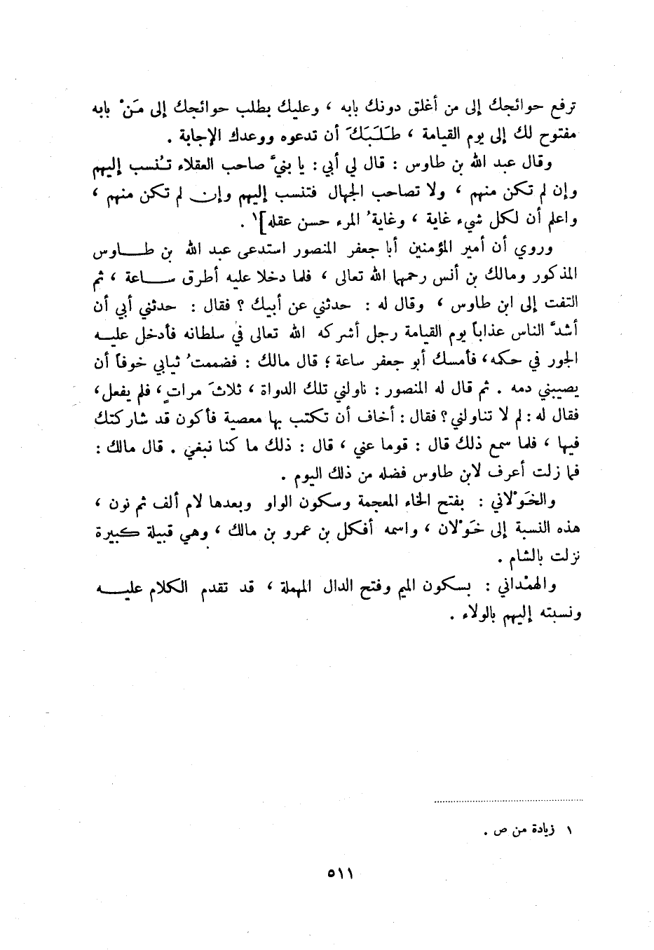 وروي أن أير المؤمنين أبا جعفر المنصور استدعى عبد الله بن طاوس المذكور ومالك بن أنس رحمهما الله تعالى، فلما دخلا عليه أطرق ساعة، ثم التفت إلى ابن طاوس، وقال له: حدثني عن أبيك فقال: حدثني أبي أن أشد الناس عذاباً يوم القيامة رجل أشركه الله تعالى في سلطانه فأدخل عليه الجور في حكمه، فأمسك أبو جعفر ساعة؛ قال مالك: فضممت ثيابي خوفاً أن يصيبني دمه. ثم قال له المنصور: ناولني تلك الدواة، ثلاث مرات، فلم يفعل، فقال له: لم لا تناولني فقال: أخاف أن تكتب بها معصية فأكون قد شاركتك فيها، فلما سمع ذلك قال: قوما عني، قال: ذلك ما كنا نبغي. قال مالك: فما زلت أعرف لابن طاوس فضله من ذلك اليوم.