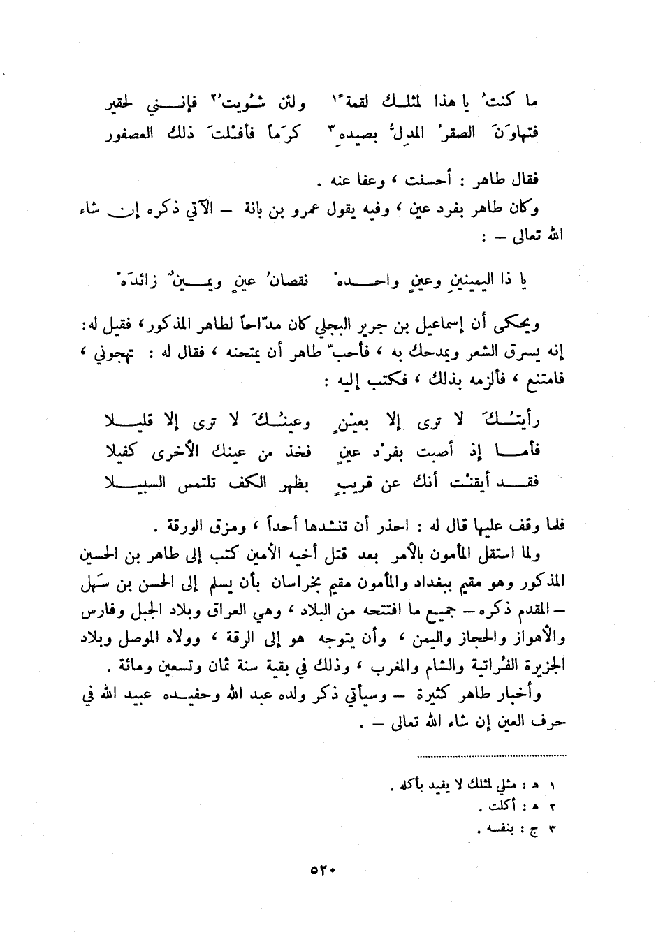 وكان طاهر بفرد عين، وفيه يقول عمرو بن بانة - الآتي ذكره إن شاء الله تعالى -: