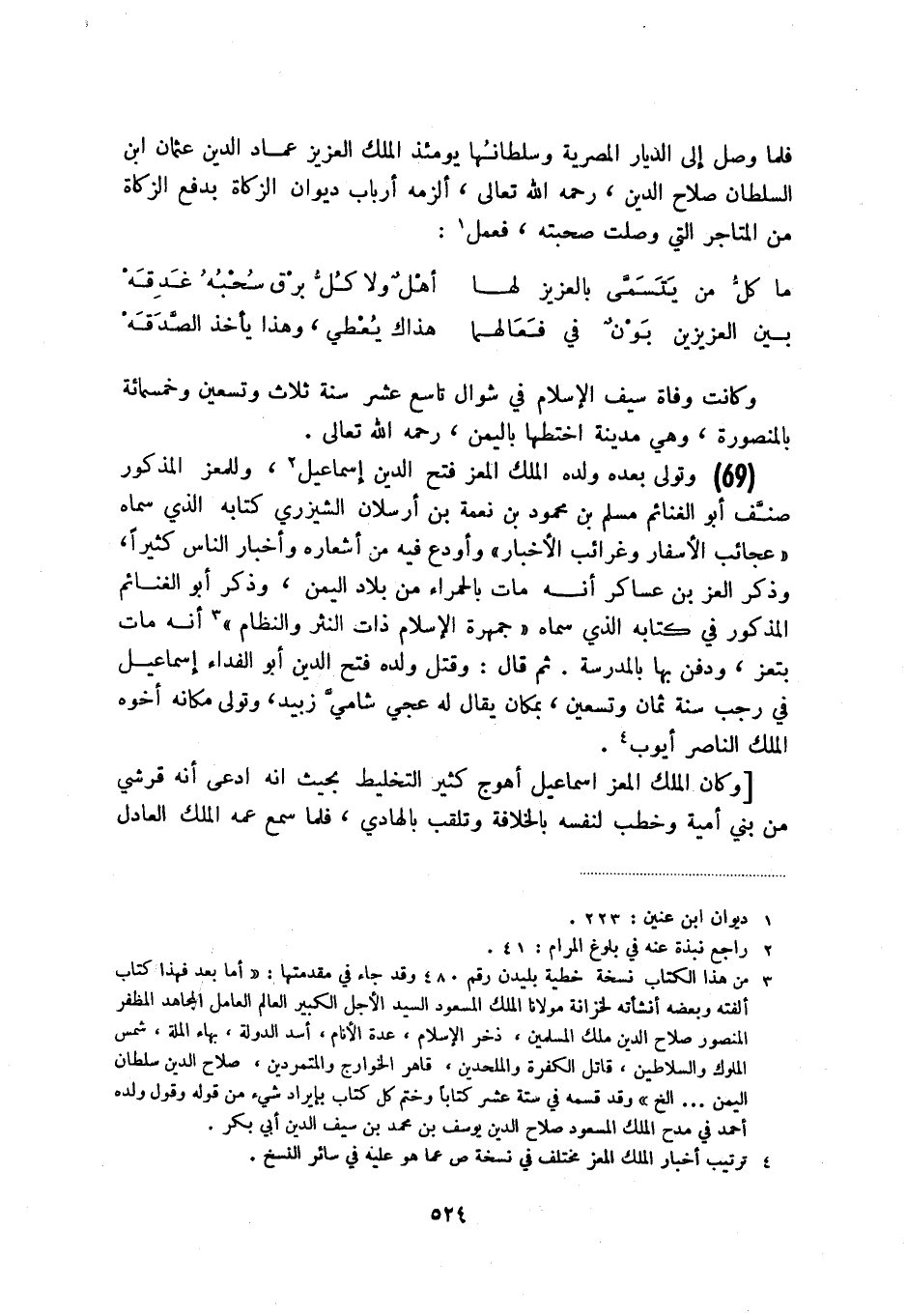 (69) وتولى بعده ولده الملك المعز فتح الدين إسماعيل (2) ، وللمعز المذكور صنف أبو الغنائم مسلم بن محمود بن نعمة بن أرسلان الشيزري كتابه الذي سماه " عجائب الأسفار وغرائب الأخبار " وأودع فيه من أشعاره وأخبار الناس كثيراً، وذكر العز بن عساكر أنه مات بالحمراء من بلاد اليمن، وذكر أبو الغنائم المذكور في كتابه الذي سماه " جمهرة الإسلام ذات النثر والنظام " (3) أنه مات بتعز، ودفن بها بالمدرسة. ثم قال: وقتل ولده فتح الدين أبو الفداء إسماعيل في رجب سنة ثمان وتسعين، بمكان يقال له عجي شامي زبيد، وتولى مكانه أخوه الملك الناصر أيوب (4) .