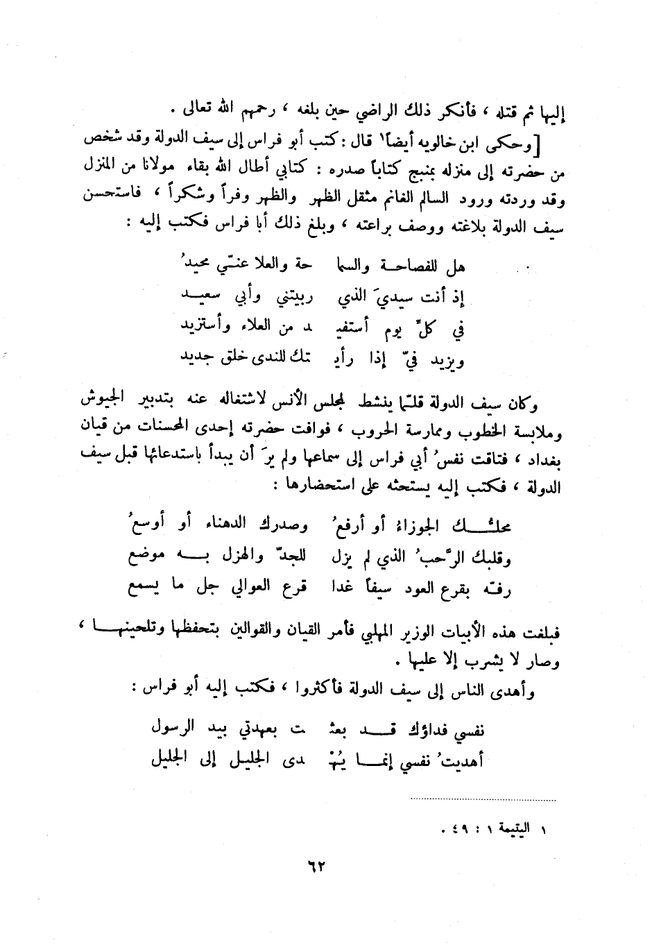 [وحكى ابن خالويه أيضاً (1) قال: كتب أبو فراس إلى سيف الدولة وقد شخص من حضرته إلى منزله بمنبج كتاباً صدره: كتابي أطال الله بقاء مولانا من المنزل وقد وردته ورود السالم الغانم مثقل الظهر والظهر وفراً وشكراً، فاستحسن سيف الدولة بلاغته ووصف براعته، وبلغ ذلك أبا فراس فكتب إليه: