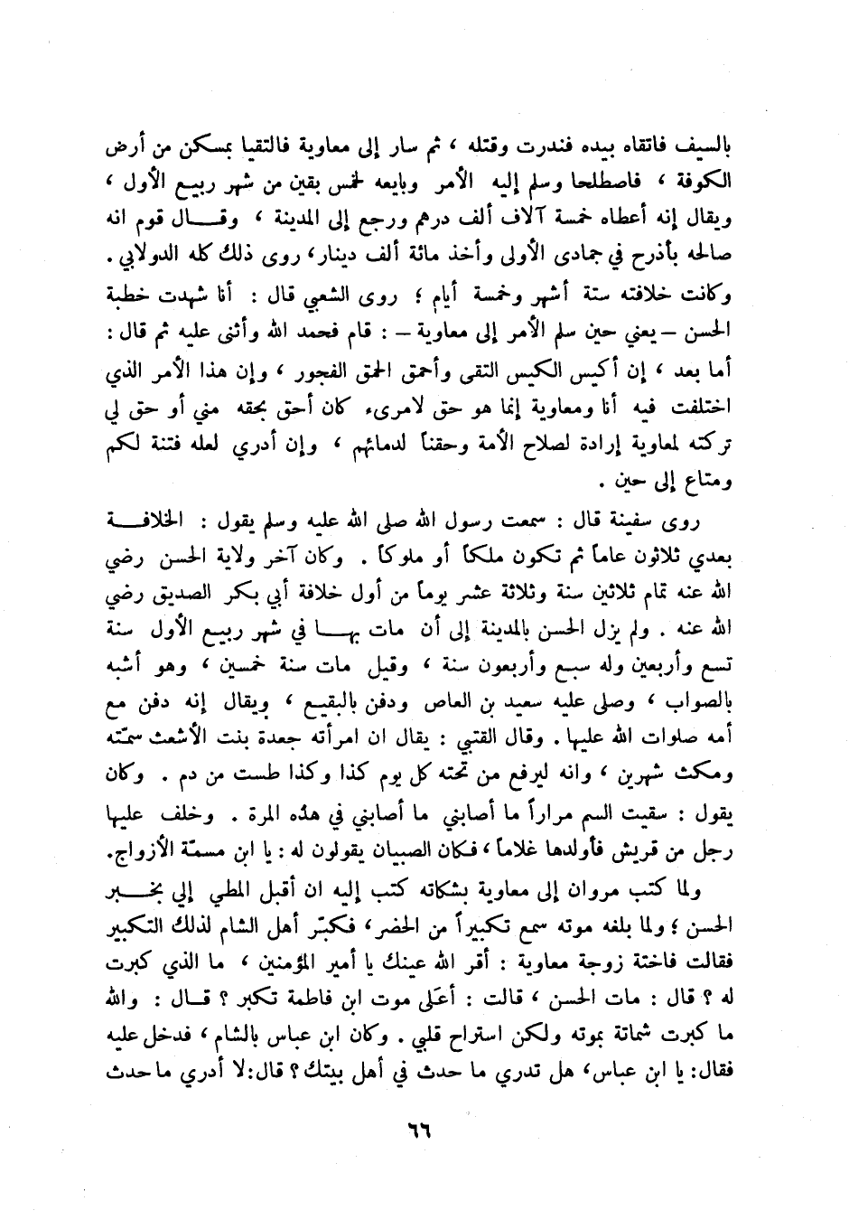 روى سفينة قال: سمعت رسول الله صلى الله عليه وسلم يقول: الخلافة بعدي ثلاثون عاماً ثم تكون ملكاً أو ملوكاً. وكان آخر ولاية الحسن رضي الله عنه تمام ثلاثين سنة وثلاثة عشر يوماً من أول خلافة أبي بكر الصديق رضي الله عنه. ولم يزل الحسن بالمدينة إلى أن مات بها في شهر ربيع الأول سنة تسع وأربعين وله سبع وأربعون سنة، وقيل مات سنة خمسين، وهو أشبه بالصواب، وصلى عليه سعيد بن العاص ودفن بالبقيع، ويقال إنه دفن مع أمه صلوات الله عليها. وقال القتبي: يقال ان امرأته جعدة بنت الأشعث سمته ومكث شهرين، وأنه ليرفع من تحته كل يوم كذا وكذا طست من دم. وكان يقول: سقيت السم مراراً ما أصابني ما أصابني في هذه المرة. وخلف عليها رجل من قريش فأولدها غلاماً، فكان الصبيان يقولون له: يا ابن مسمة الأزواج.