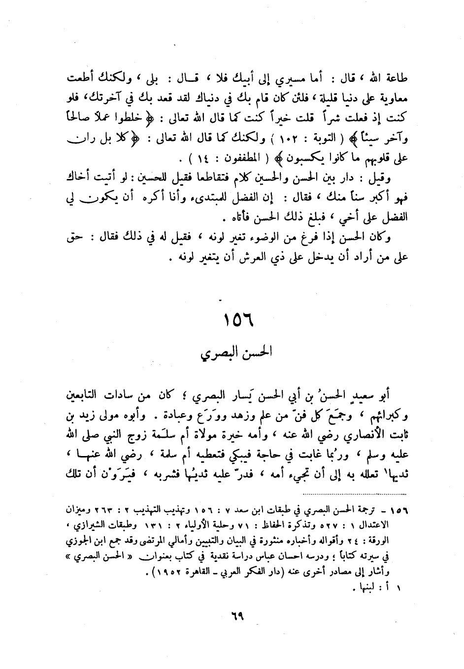 (1) ترجمة الحسن البصري في طبقات ابن سعد 7: 16 وتهذيب التهذيب 2: 263 وميزان الاعتدال 1: 527 وتذكرة الحفاظ: 71 وحلية الأولياء 2: 131 وطبقات الشيرازي، الورقة: 24 وأقواله وأخباره منثورة في البيان والتبيين وأمالي المرتضى وقد جمع ابن الجوزي في سيرته كتاباً؛ ودرسه إحسان عباس دراسة نقدية في كتاب بعنوان " الحسن البصري " واشار إلى مصادر أخرى عنه (دار الفكر العربي - القاهرة 1952) .