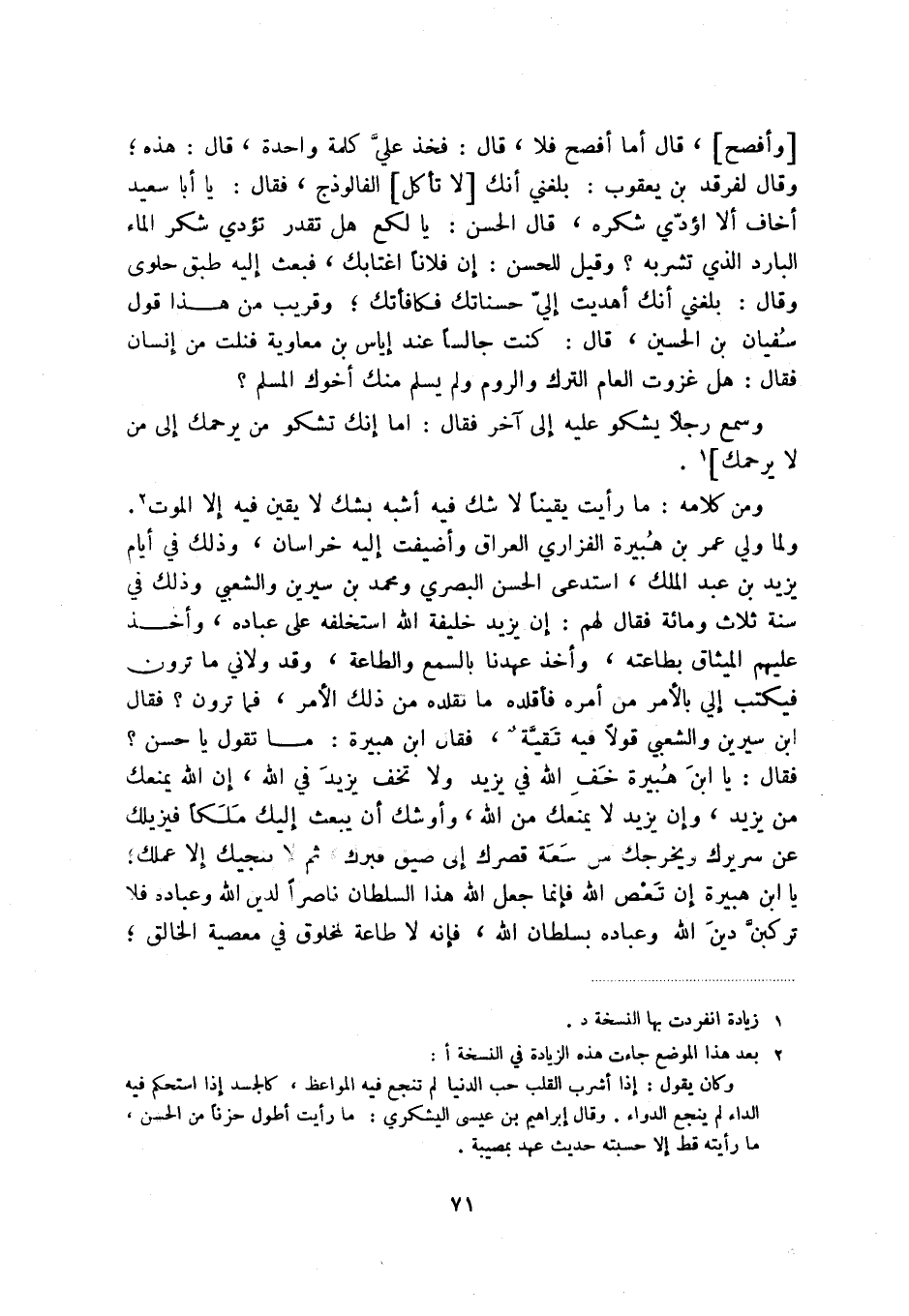 (2) بعد هذا الموضع جاءت هذه الزيادة في النسخة أ: وكان يقول: إذا أشرب القلب حب الدنيا لم تنجع فيه المواعظ، كالجد إذا استحكم فيه الداء لم ينجع الدراء. وقال إبراهيم بن عيسى اليشكري: ما رأيت أطول حزناً من الحسن، ما رأيته قط إلا حسبته حديث عهد بمصيبة.