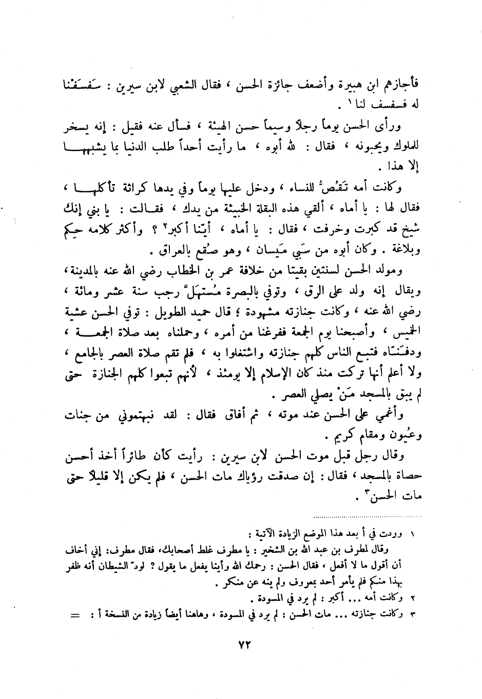 (3) وكانت جنازته ... مات الحسن: لم يرد في المسودة، وهاهنا يضاً زيادة من النسخة أ: وحكى المعافى بن زكريا في كتاب " الجليس والأنيس " عن الأصمعي قال: حدثنا مبارك ابن فضالة عن ثابت البناني قال: انصرفت من جنازة الحسن فقلت لبنتي: والله ما رأيت جنازة قط اجتمع فيها من الناس اجتمع فيها وإن كان الحسن لأهلاً لذلك، فقالت لي بنتي: يا أبه، ما ذلك إلا لستر الله، فحجزت والله نفسي.