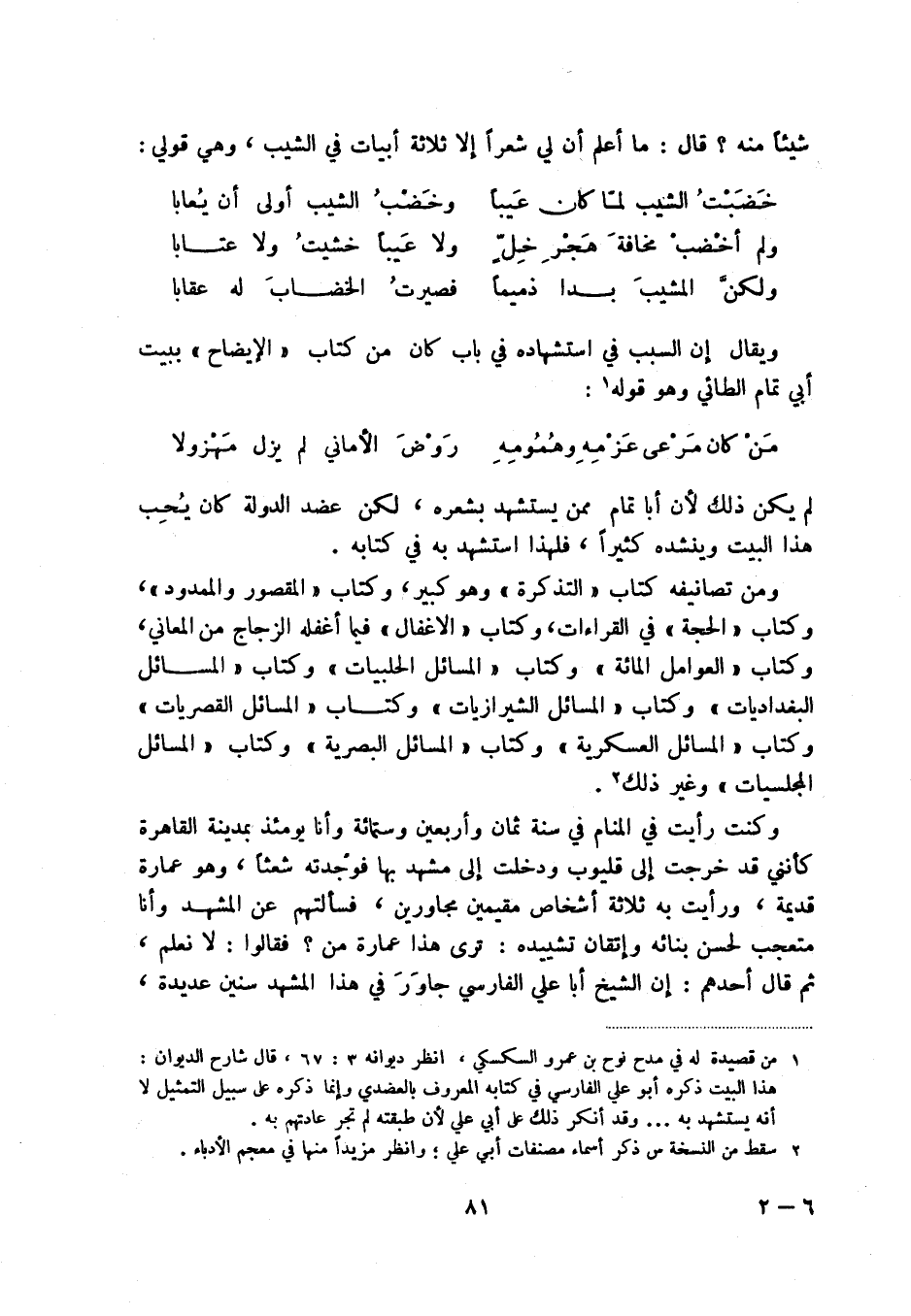 ولكن المشيب بدا ذميماً ... فصيرت الخضاب له عقابا ويقال إن السبب في استشهاده في باب كان من كتاب " الإيضاح " ببيت أبي تمام الطائي وهو قوله (1) :
