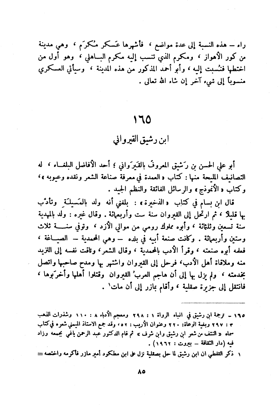 (1) ترجمة ابن رشيق في انباه الرواة 1: 298 ومعجم الأدباء 8: 110 وشذرات الذهب 3: 297 وبغية الوعاة: 220 وعنوان الأريب: 52، وقد جمع الأستاذ الميمني شعره في كتاب سماه " النتف من شعر ابن رشيق وابن شرف " ثم قام الدكتور عبد الرحمن ياغي بجمعه وزاد فيه (دار الثقافة - بيروت: 1962) .
