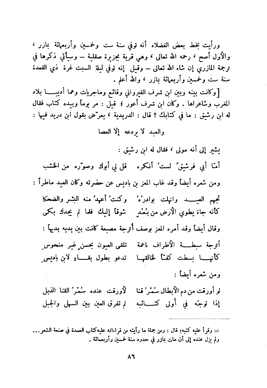 أما أبي فرشيق لست أنكره ... قل لي أبوك وصوره من الخشب ومن شعره أيضاً وقد غاب المعز بن باديس عن حضرته وكان العيد ماطراً: