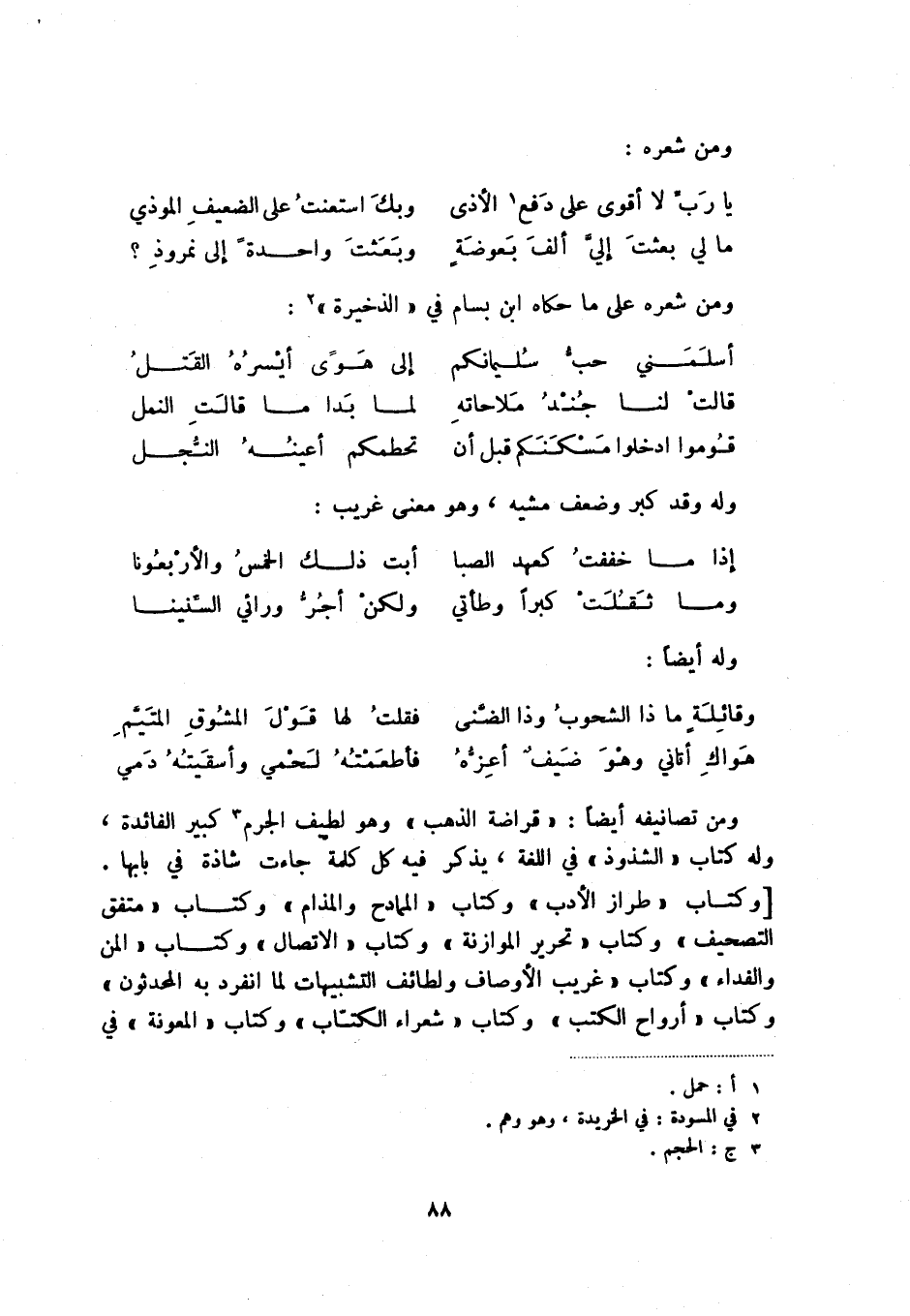 هواك أتاني وهو ضيف أعزه ... فأطعمته لحمي واسقيته دمي ومن تصانيفه أيضاً: " قراضة الذهب "، وهو لطيف الجرم (3) كبير الفائدة، وله كتاب " الشذوذ " في اللغة، يذكر فيه كل كلمة جاءت شاذة في بابها. [وكتاب " طراز الأدب " وكتاب " الممادح والمذام " وكتاب " متفق التصحيف " وكتاب " تحرير الموازنة " وكتاب " الاتصال " وكتاب " المن والفداء " وكتاب " غريب الأوصاف التشبيهات لما انفرد به المحدثون " وكتاب " أرواح الكتب " وكتاب " شعراء الكتاب " وكتاب " المعونة " في