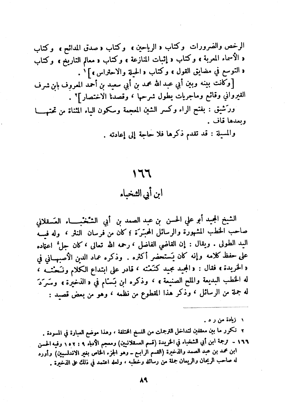 (3) ترجمة ابن أبي الشخباء في الخريدة قسم العسقلاني) ومعجم الأدباء 9: 152 وفيه الحسن ابن محمد بن عبد الصمد والذخيرة (القسم الرابع - وهو الجزء الخاص بغير الأندلسيين) وأورد له صاحب الريحان والريعان جملة من رسائله وخطبه، ولعله اعتمد في ذلك على الذخيرة.