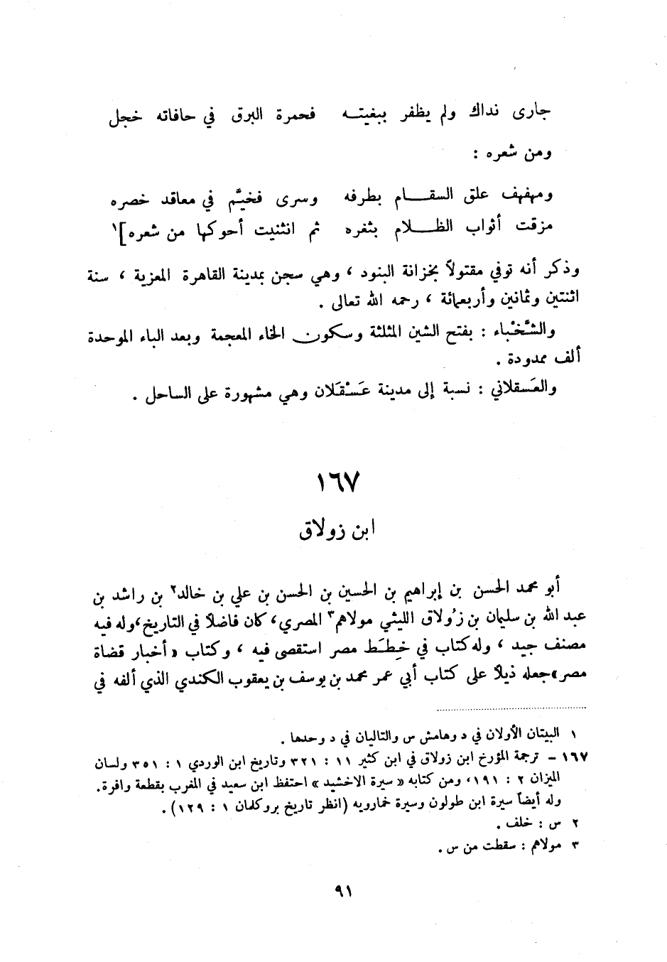 (2) ترجمة المؤرخ ابن زولاق في ابن كثير 11: 321 وتاريخ ابن الوردي 1: 351 ولسان الميزان 2: 191، ومن كتابه " سيرة الاخشيد " احتفظ ابن سعيد في المغرب بقطعة وافرة. وله أيضاً سيرة ابن طولون وسيرة خمارويه (انظر تاريخ بروكلمان 1: 129) .