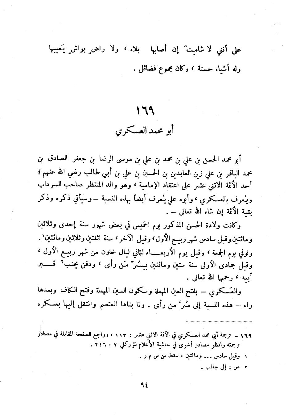 (1) ترجمة أبي محمد العسكري في الأئمة الأثني عشر: 113، وراجع الصفحة المقابلة في مصادر ترجمته وانظر مصادر أخرى في حاشية الأعلام للزركلي 2: 216.