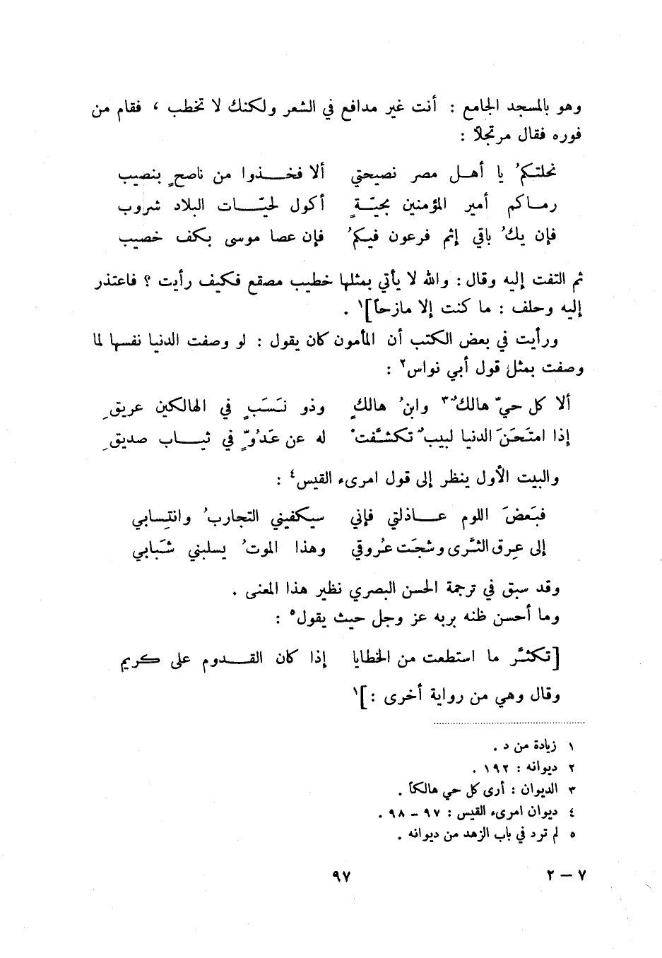 إذا امتحن الدنيا لبيب تكشفت ... له عن عدو في ثياب صديق والبيت الأول ينظر إلى قول امرئ القيس (4) :