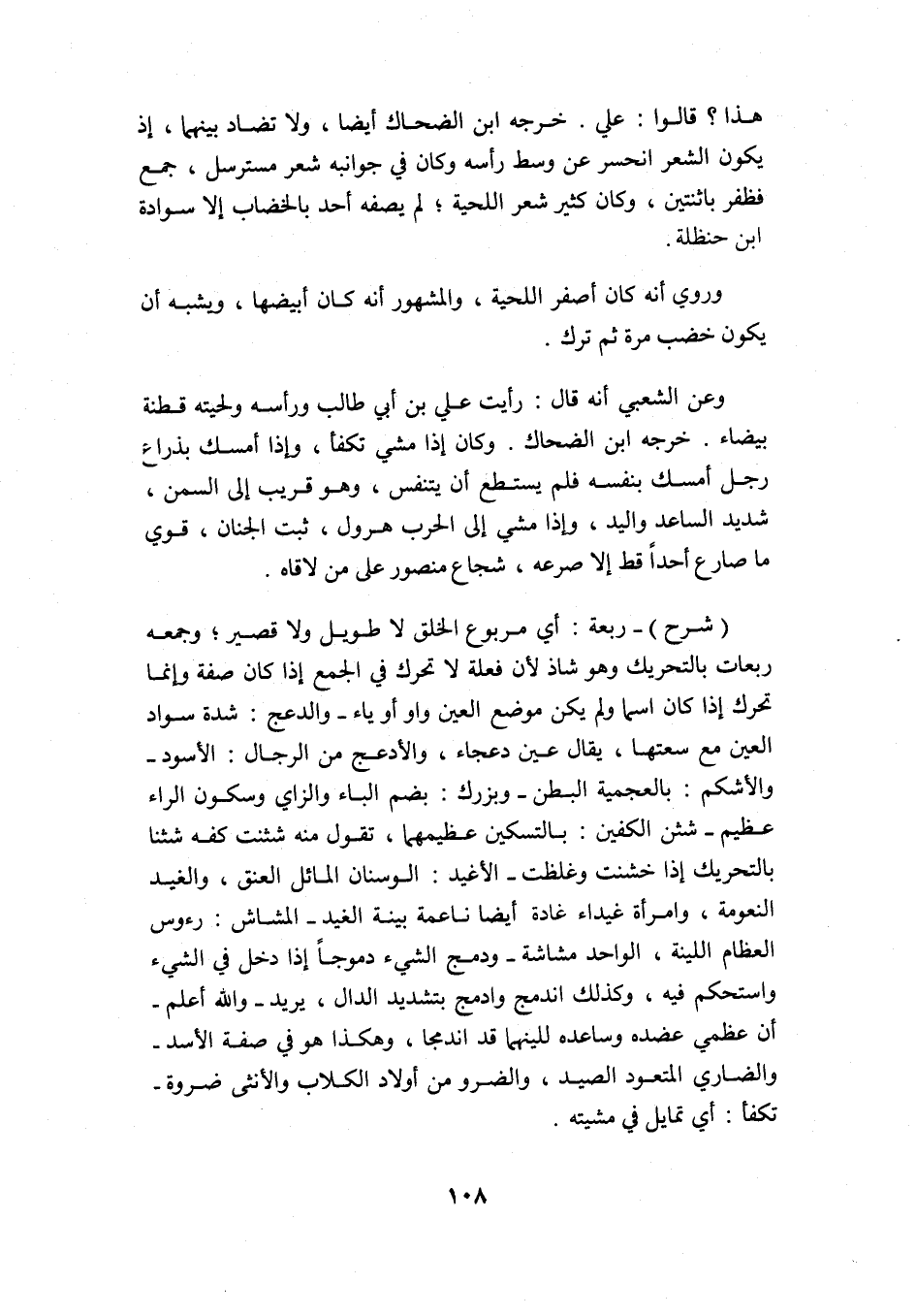"شرح" ربعة أي: مربوع الخلق لا طويل ولا قصير؛ وجمعه: ربعات بالتحريك وهو شاذ؛ لأن فعلة لا تحرك في الجمع إذا كان صفة وإنما تحرك إذا كان اسما ولم يكن موضع العين واو أو ياء, والدعج: شدة سواد العين مع سعتها، يقال: عين دعجاء، والأدعج من الرجال: الأسود, والأشكم بالعجمية: البطن, وبزرك بضم الباء والزاي وسكون الراء: عظيم, شثن الكفين بالتسكين: عظيمهما، تقول منه: شثنت كفه شثنا بالتحريك: إذا خشنت وغلظت, الأغيد: الوسنان المائل العنق والغيد: النعومة، وامرأة غيداء وغادة أيضا: ناعمة بينة الغيد, المشاش: رءوس العظام اللينة، الواحد: مشاشة, ودمج الشيء دموجًا: إذا دخل في الشيء واستحكم فيه، وكذلك اندمج وادّمج بتشديد الدال، يريد -والله أعلم- أن عظمي عضده وساعده للينهما قد اندمجا، وهكذا هو في صفة الأسد, والضاري: المتعود الصيد، والضرو من أولاد الكلاب والأنثى ضروة, تكفأ أي: تمايل في مشيته.