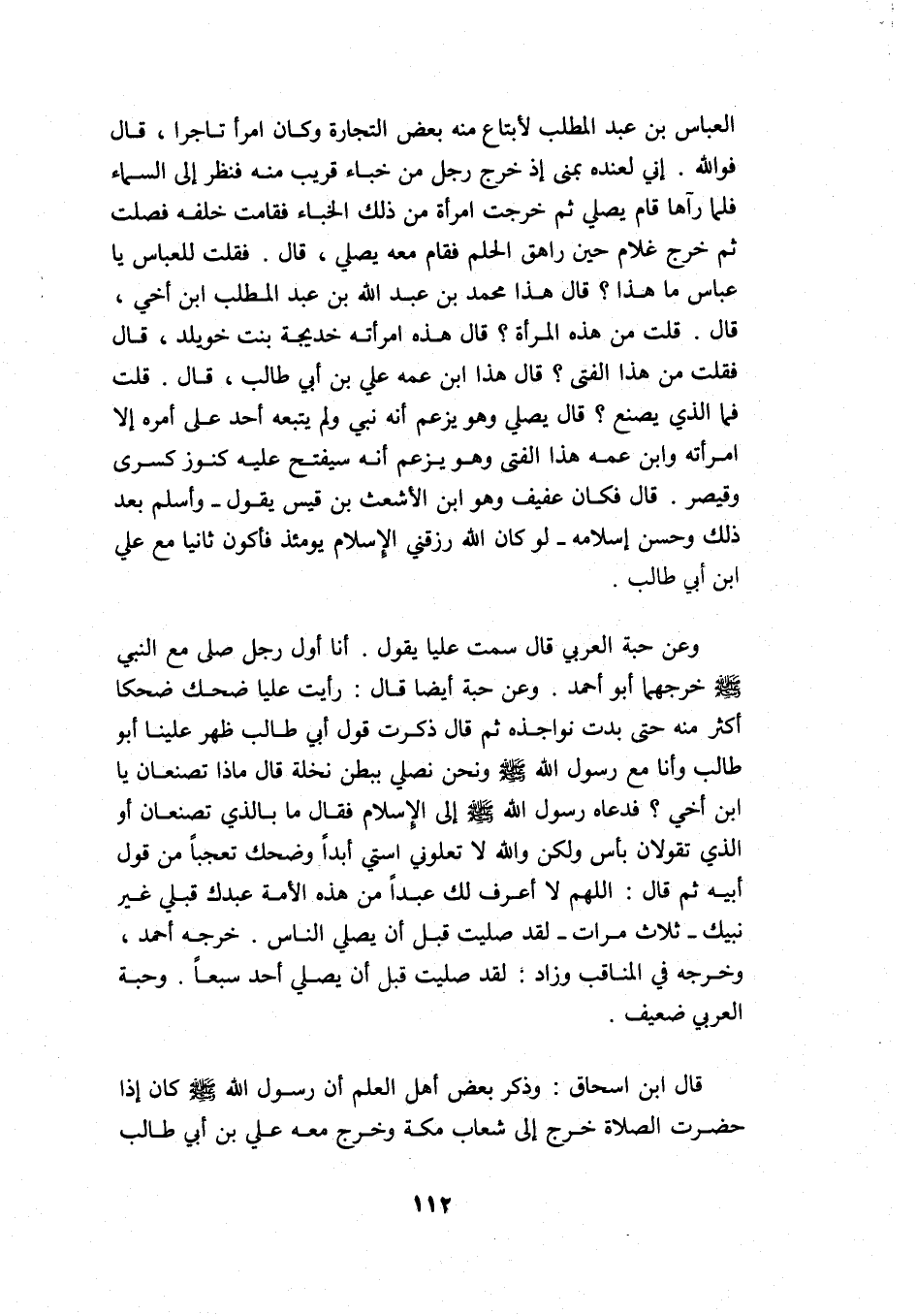 العباس بن عبد المطلب لأبتاع منه بعض التجارة وكان امرأ تاجرا، قال: فوالله إني لعنده بمنى إذ خرج رجل من خباء قريب منه, فنظر إلى السماء فلما رآها قام يصلي, ثم خرجت امرأة من ذلك الخباء فقامت خلفه فصلت, ثم خرج غلام حين راهق الحلم فقام معه يصلي، قال: فقلت للعباس: يا عباس ما هذا? قال: هذا محمد بن عبد الله بن عبد المطلب ابن أخي، قال: قلت: من هذه المرأة? قال: هذه امرأته خديجة بنت خويلد، قال: فقلت: من هذا الفتى? قال: هذا ابن عمه علي بن أبي طالب، قال: قلت: فما الذي يصنع? قال: يصلي وهو يزعم أنه نبي ولم يتبعه أحد على أمره إلا امرأته وابن عمه هذا الفتى, وهو يزعم أنه سيفتح عليه كنوز كسرى وقيصر. قال: فكان عفيف وهو ابن الأشعث بن قيس يقول, وأسلم بعد ذلك وحسن إسلامه: لو كان الله رزقني الإسلام يومئذ, فأكون ثانيا مع علي بن أبي طالب.