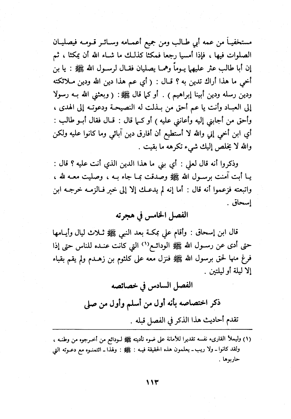 مستخفيًا من عمه أبي طالب ومن جميع أعمامه وسائر قومه فيصليان الصلوات فيها، فإذا أمسيا رجعا فمكثا كذلك ما شاء الله أن يمكثا، ثم إن أبا طالب عثر عليهما يومًا وهما يصليان فقال لرسول الله -صلى الله عليه وسلم: يابن أخي ما هذا أراك تدين به? قال: "أي عم, هذا دين الله ودين ملائكته ودين رسله ودين أبينا إبراهيم" أو كما قال صلى الله عليه وسلم: "وبعثني الله به رسولا إلى العباد, وأنت يا عم أحق من بذلت له النصيحة ودعوته إلى الهدى، وأحق من أجابني إليه وأعانني عليه" أو كما قال: قال: فقال أبو طالب: أي ابن أخي, إني والله لا أستطيع أن أفارق دين آبائي وما كانوا عليه, ولكن والله لا يخلص إليك شيء تكرهه ما بقيت.