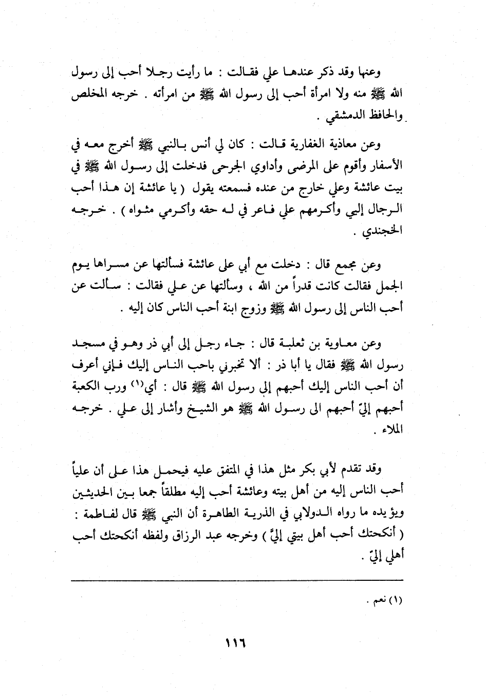وعنها, وقد ذكر عندها علي فقالت: ما رأيت رجلا أحب إلى رسول الله -صلى الله عليه وسلم- منه, ولا امرأة أحب إلى رسول الله -صلى الله عليه وسلم- من امرأته. خرجه المخلص والحافظ الدمشقي.