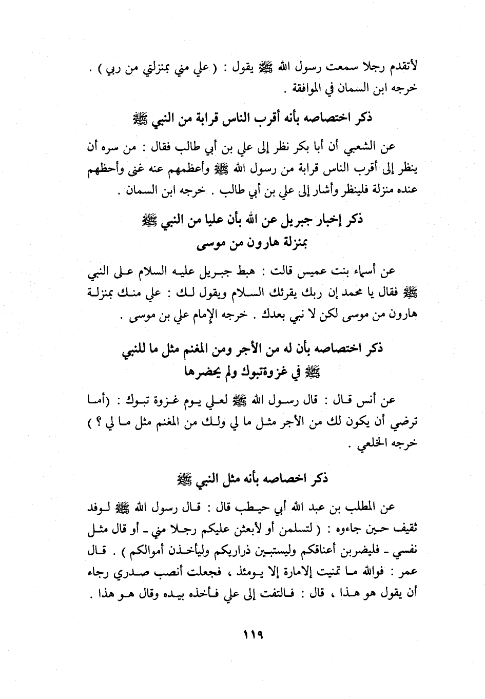 عن أسماء بنت عميس قالت: هبط جبريل -عليه السلام- على النبي -صلى الله عليه وسلم- فقال: يا محمد, إن ربك يقرئك السلام ويقول لك: علي منك بمنزلة هارون من موسى لكن لا نبي بعدك. خرجه الإمام علي بن موسى.