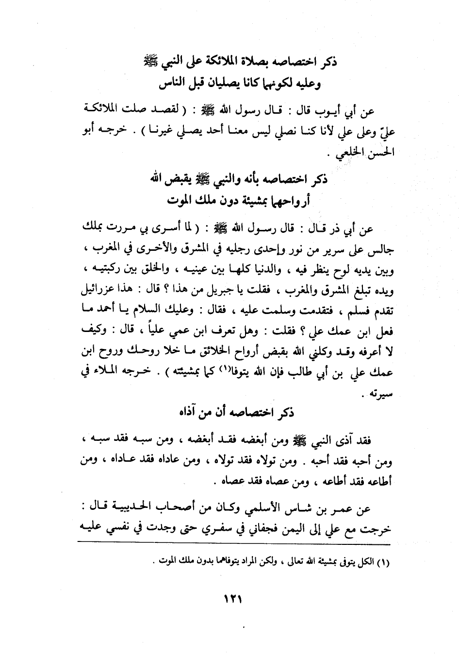عن أبي ذر قال: قال رسول الله -صلى الله عليه وسلم: "لما أسرى بي, مررت بملك جالس على سرير من نور وإحدى رجليه في المشرق والأخرى في المغرب، وبين يديه لوح ينظر فيه، والدنيا كلها بين عينيه، والخلق بين ركبتيه، ويده تبلغ المشرق والمغرب، فقلت: يا جبريل من هذا? قال: هذا عزرائيل تقدم فسلم، فتقدمت وسلمت عليه، فقال: وعليك السلام يا أحمد, ما فعل ابن عمك علي? فقلت: وهل تعرف ابن عمي عليا؟ قال: وكيف لا أعرفه وقد وكلني الله بقبض أرواح الخلائق ما خلا روحك وروح ابن عمك علي بن أبي طالب, فإن الله يتوفا 1 كما بمشيئته" خرجه الملاء في سيرته.