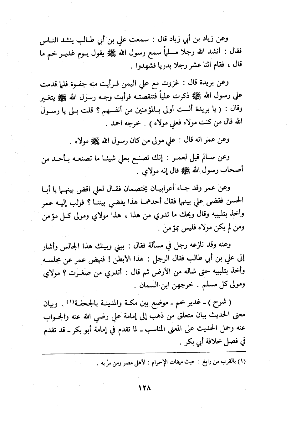 "شرح" غدير خم: موضع بين مكة والمدينة بالجحفة1. وبيان معنى الحديث بيان متعلق من ذهب إلى إمامة علي -رضي الله عنه- والجواب عنه وحمل الحديث على المعنى المناسب -لما تقدم في إمامة أبو بكر- قد تقدم في فصل خلافة أبي بكر.