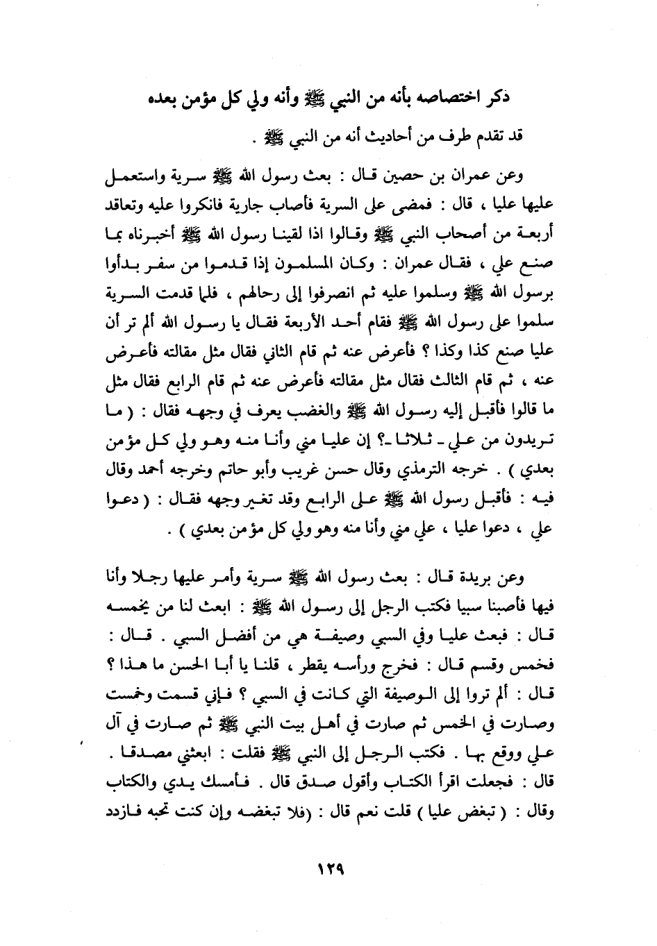 وعن عمران بن حصين قال: بعث رسول الله -صلى الله عليه وسلم- سرية واستعمل عليها عليا، قال: فمضى على السرية فأصاب جارية, فأنكروا عليه وتعاقد أربعة من أصحاب النبي -صلى الله عليه وسلم- وقالوا: إذا لقينا رسول الله -صلى الله عليه وسلم- أخبرناه بما صنع علي، فقال عمران: وكان المسلمون إذا قدموا من سفر بدءوا برسول الله -صلى الله عليه وسلم- وسلموا عليه ثم انصرفوا إلى رحالهم، فلما قدمت السرية سلموا على رسول الله -صلى الله عليه وسلم- فقام أحد الأربعة فقال: يا رسول الله ألم تر أن عليا صنع كذا وكذا? فأعرض عنه ثم قام الثاني فقال مثل مقالته فأعرض عنه، ثم قام الثالث فقال مثل مقالته فأعرض عنه ثم قام الرابع فقال مثل ما قالوا, فأقبل إليه رسول الله -صلى الله عليه وسلم- والغضب يعرف في وجهه فقال: "ما تريدون من علي -ثلاثًا-؟ إن عليا مني وأنا منه, وهو ولي كل مؤمن بعدي" خرجه الترمذي وقال: حسن غريب وأبو حاتم, وخرجه أحمد وقال فيه: فأقبل رسول الله -صلى الله عليه وسلم- على الرابع وقد تغير وجهه فقال: "دعوا عليا، دعوا عليا، علي مني وأنا منه وهو ولي كل مؤمن بعدي".