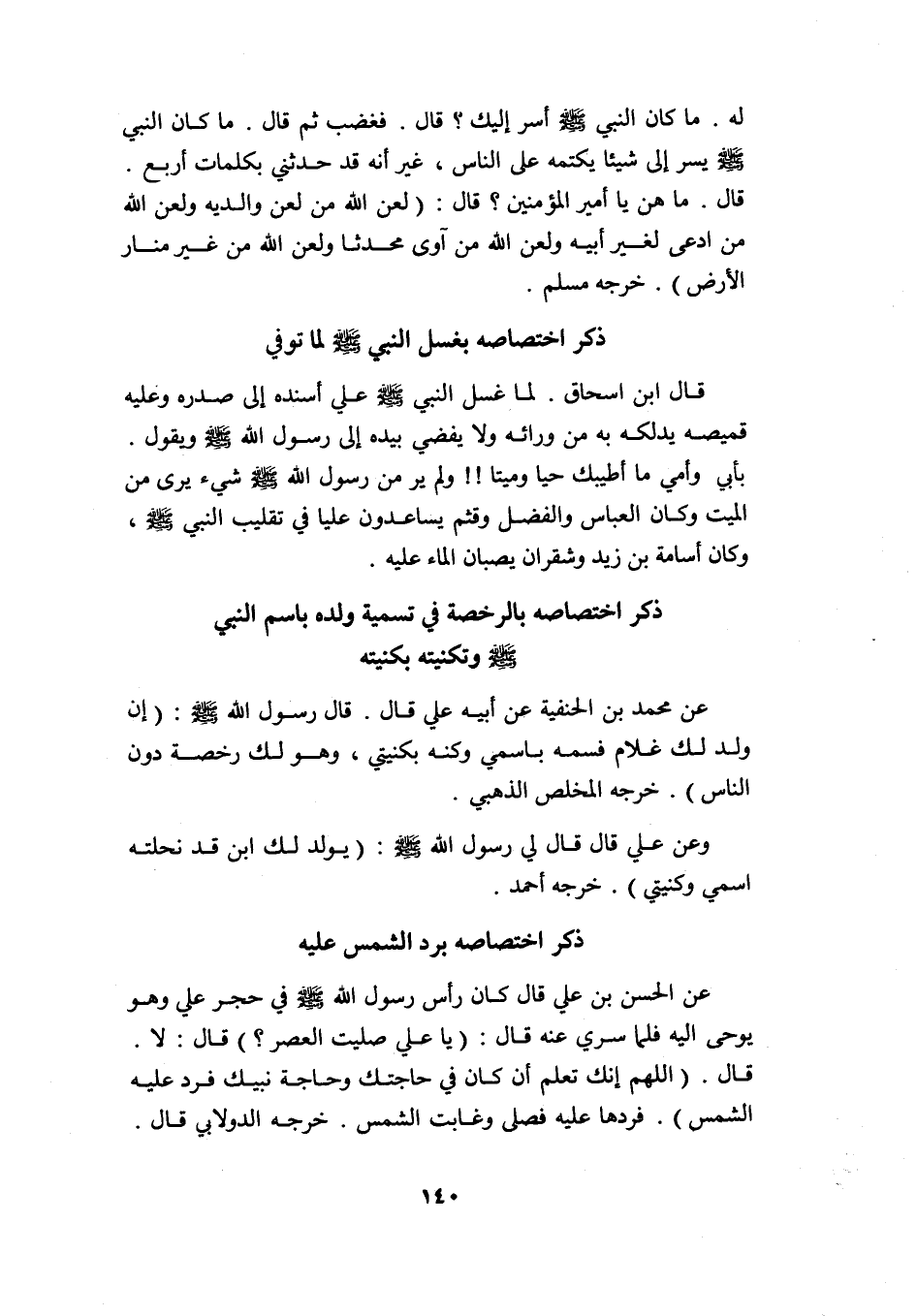عن الحسن بن علي قال: كان رأس رسول الله -صلى الله عليه وسلم- في حجر علي وهو يوحى إليه فلما سري عنه قال: "يا علي صليت العصر?" قال: لا قال: "اللهم إنك تعلم أن كان في حاجتك وحاجة نبيك فرد عليه الشمس" فردها عليه فصلى وغابت الشمس. خرجه الدولابي قال: