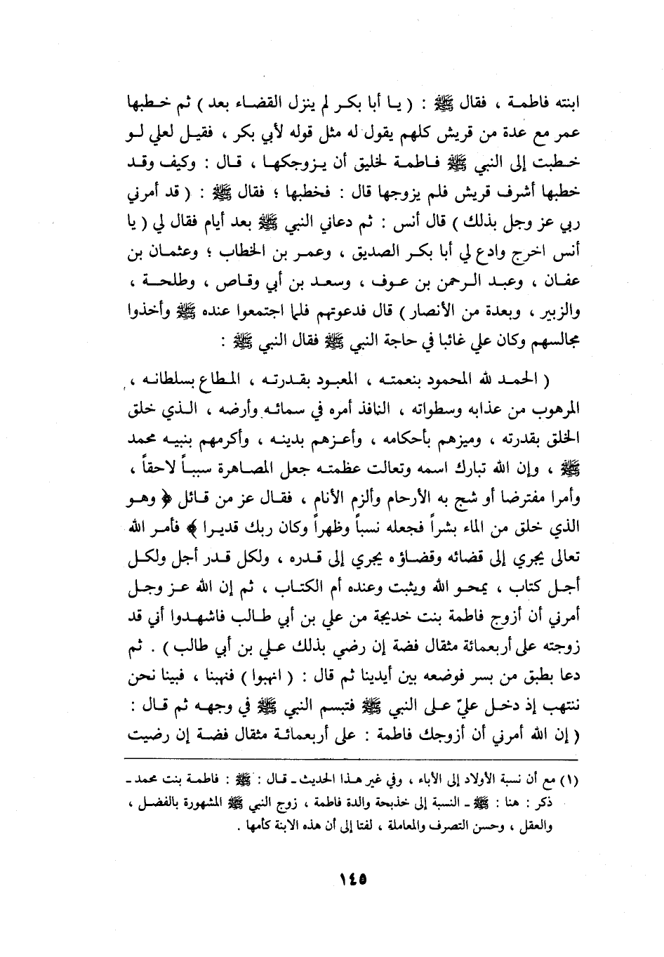 $"الحمد لله المحمود بنعمته، المعبود بقدرته، المطاع بسلطانه، المرهوب من عذابه وسطواته، النافذ أمره في سمائه وأرضه، الذي خلق الخلق بقدرته، وميزهم بأحكامه، وأعزهم بدينه، وأكرمهم بنبيه محمد -صلى الله عليه وسلم- وإن الله تبارك اسمه وتعالت عظمته جعل المصاهرة سببًا لاحقًا، وأمرًا مفترضًا أوشج به الأرحام وألزم الأنام، فقال عز من قائل: {وَهُوَ الَّذِي خَلَقَ مِنَ الْمَاءِ بَشَرًا فَجَعَلَهُ نَسَبًا وَصِهْرًا وَكَانَ رَبُّكَ قَدِيرًا} فأمر الله تعالى يجري إلى قضائه, وقضاؤه يجري إلى قدره، ولكل قدر أجل ولكل أجل كتاب، يمحو الله ويثبت وعنده أم الكتاب، ثم إن الله -عز وجل- أمرني أن أزوج فاطمة بنت خديجة1 من علي بن أبي طالب فاشهدوا أني قد زوجته على أربعمائة مثقال فضة, إن رضي بذلك علي بن أبي طالب" ثم دعا بطبق من بسر فوضعه بين أيدينا ثم قال: "انهبوا" فنهبنا، فبينا نحن ننتهب إذ دخل علي على النبي -صلى الله عليه وسلم- فتبسم النبي -صلى الله عليه وسلم- في وجهه ثم قال: "إن الله أمرني أن أزوجك فاطمة على أربعمائة مثقال فضة, إن رضيت