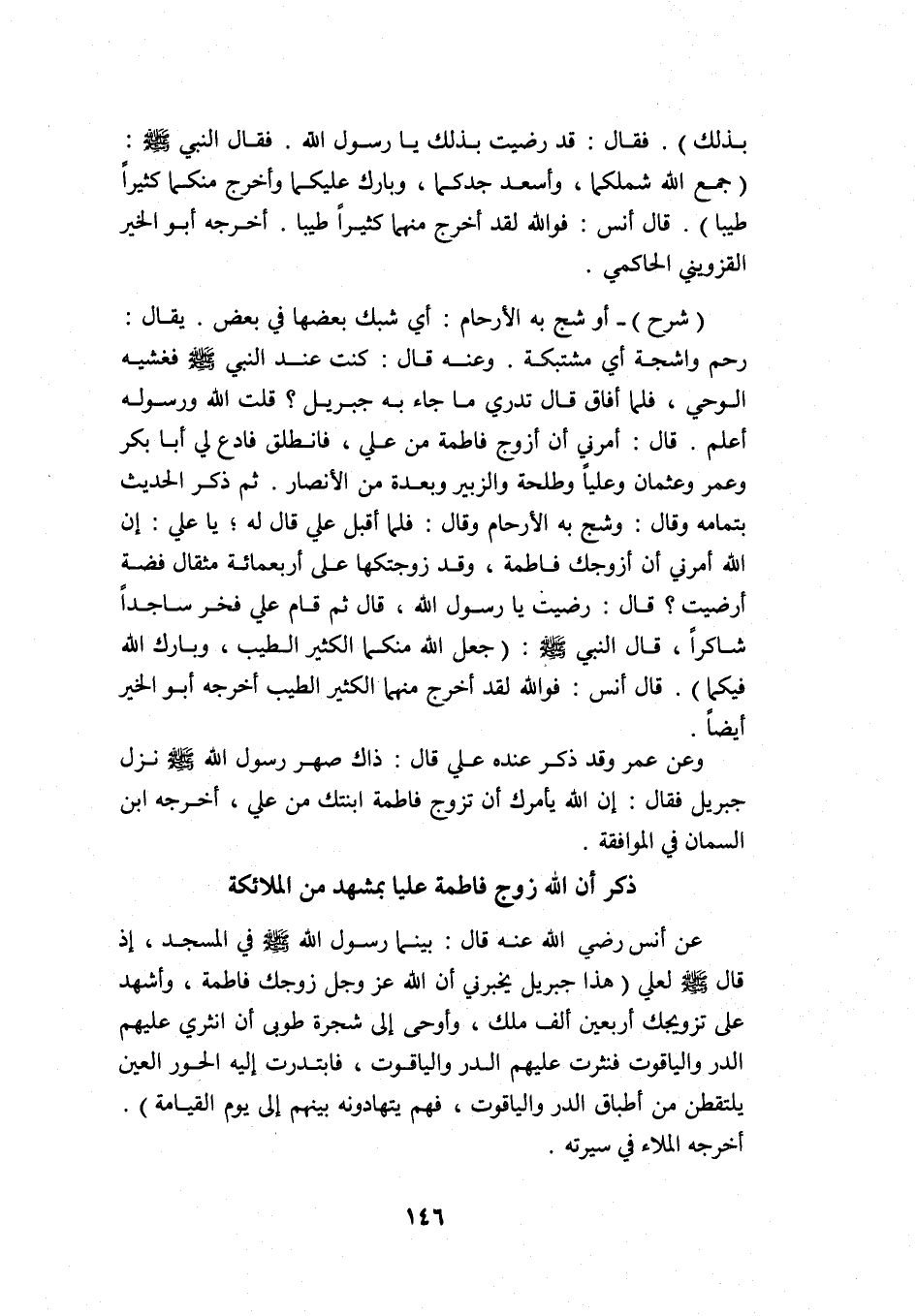 "شرح" أوشج به الأرحام أي: شبك بعضها في بعض, يقال: رحم واشجة أي: مشتبكة. وعنه قال: كنت عند النبي -صلى الله عليه وسلم- فغشيه الوحي، فلما أفاق قال: "تدري ما جاء به جبريل?" قلت: الله ورسوله أعلم, قال: "أمرني أن أزوج فاطمة من علي" فانطلق فادع لي أبا بكر وعمر وعثمان وعليا وطلحة والزبير وبعدة من الأنصار. ثم ذكر الحديث بتمامه وقال: وشج به الأرحام وقال: فلما أقبل علي قال له: "يا علي, إن الله أمرني أن أزوجك فاطمة، وقد زوجتكها على أربعمائة مثقال فضة أرضيت?" قال: رضيت يا رسول الله، قال: ثم قام علي فخر ساجدًا شاكرًا، قال النبي -صلى الله عليه وسلم: "جعل الله منكما الكثير الطيب، وبارك الله فيكما" قال أنس: فوالله لقد أخرج منهما الكثير الطيب. أخرجه أبو الخير أيضًا.