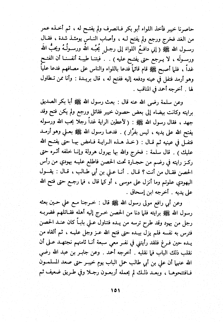 وعن سلمة -رضى الله عنه- قال: بعث رسول الله -صلى الله عليه وسلم- أبا بكر الصديق برايته وكانت بيضاء إلى بعض حصون خيبر, فقاتل ورجع ولم يكن فتح وقد جهد، فقال رسول الله -صلى الله عليه وسلم: "لأعطين الراية غدًا رجلًا يحب الله ورسوله يفتح الله على يديه، ليس بفرار" فدعا رسول الله -صلى الله عليه وسلم- بعلي وهو أرمد فتفل في عينيه ثم قال: "خذ هذه الراية فامض بها, حتى يفتح الله عليك" قال سلمة: فخرج والله بها يهرول هرولة وإنا خلفه أثره, حتى ركز رايته في رضم من حجارة تحت الحصن فاطلع عليه يهودي من رأس الحصن فقال: من أنت? قال: أنا علي بن أبي طالب، قال: يقول اليهودي: علوتم وما أنزل على موسى، أو كما قال، فما رجع حتى فتح الله على يديه. أخرجه ابن إسحاق.