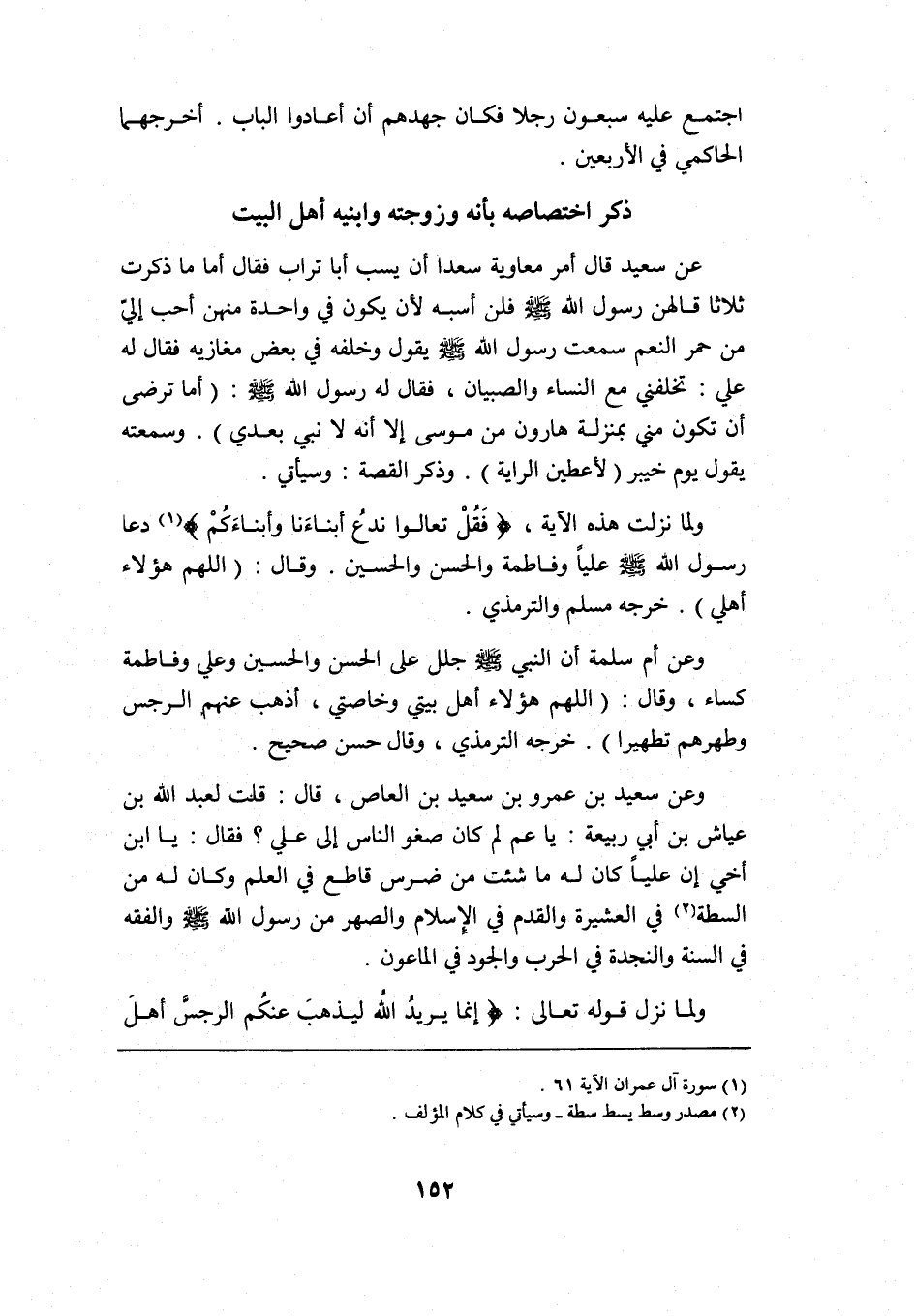 ولما نزلت هذه الآية: {فَقُلْ تَعَالَوْا نَدْعُ أَبْنَاءَنَا وَأَبْنَاءَكُمْ} 1 دعا رسول الله -صلى الله عليه وسلم- عليا وفاطمة والحسن والحسين وقال: $"اللهم هؤلاء أهلي" خرجه مسلم والترمذي.