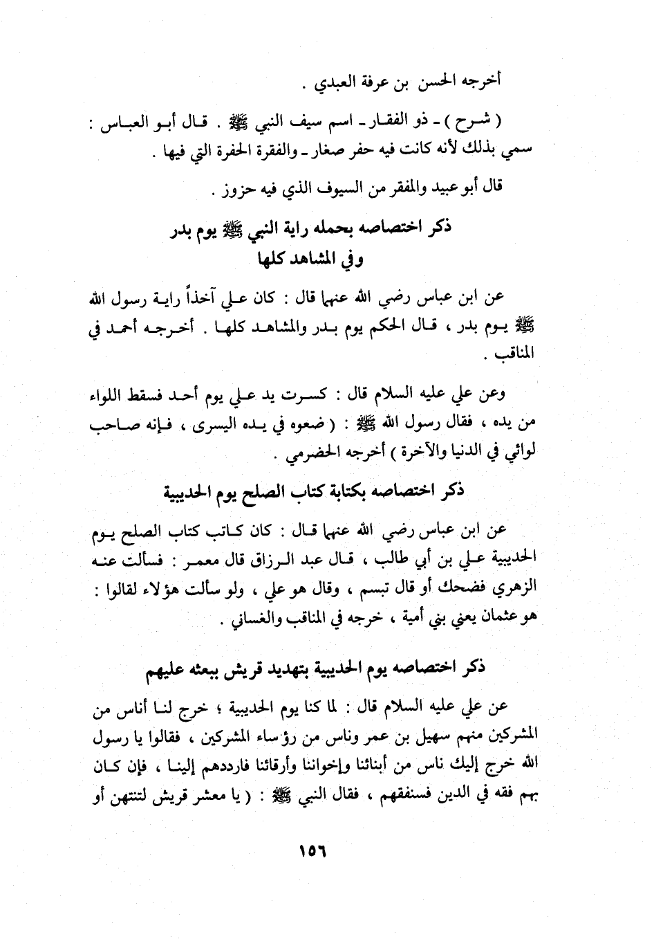 عن ابن عباس -رضي الله عنهما- قال: كان كاتب كتاب الصلح يوم الحديبية علي بن أبي طالب، قال عبد الرزاق: قال معمر: فسألت عنه الزهري فضحك أو قال: تبسم، وقال: هو علي، ولو سألت هؤلاء لقالوا: هو عثمان يعني بني أمية، خرجه في المناقب والغساني.