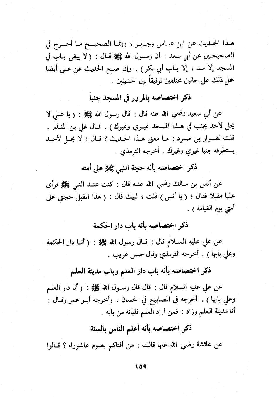 عن أبي سعيد -رضي الله عنه- قال: قال رسول الله -صلى الله عليه وسلم: "يا علي, لا يحل لأحد يجنب في هذا المسجد غيري وغيرك" قال علي بن المنذر: قلت لضرار بن صرد: ما معنى هذا الحديث? قال: لا يحل لأحد يستطرقه جنبا غيري وغيرك. أخرجه الترمذي.