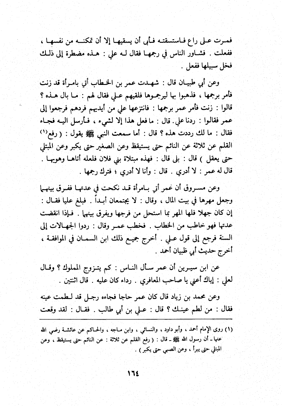وعن أبي ظبيان قال: شهدت عمر بن الخطاب أتي بامرأة قد زنت فأمر برجمها، فذهبوا بها ليرجموها فلقيهم علي فقال لهم: ما بال هذه? قالوا: زنت فأمر عمر برجمها, فانتزعها علي من أيديهم فردهم فرجعوا إلى عمر فقالوا: ردنا علي. قال: ما فعل هذا إلا لشيء، فأرسل إليه فجاء فقال: ما لك رددت هذه? قال: أما سمعت النبي -صلى الله عليه وسلم- يقول: "رفع 1 القلم عن ثلاثة: عن النائم حتى يستيقظ, وعن الصغير حتى يكبر, وعن المبتلى حتى يعقل"؟ قال: بلى قال: فهذه مبتلاة بني فلان فلعله أتاها وهويها. قال له عمر: لا أدري. قال: وأنا لا أدري؛ فترك رجمها.