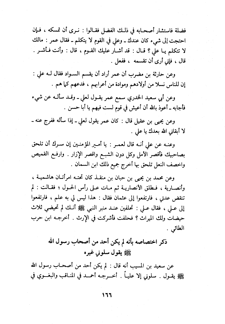 وعن حارثة بن مضرب أن عمر أراد أن يقسم السواد فقال له علي: إن للناس نسلًا من أولادهم وموادة من أعرابهم، فدعهم كما هم.