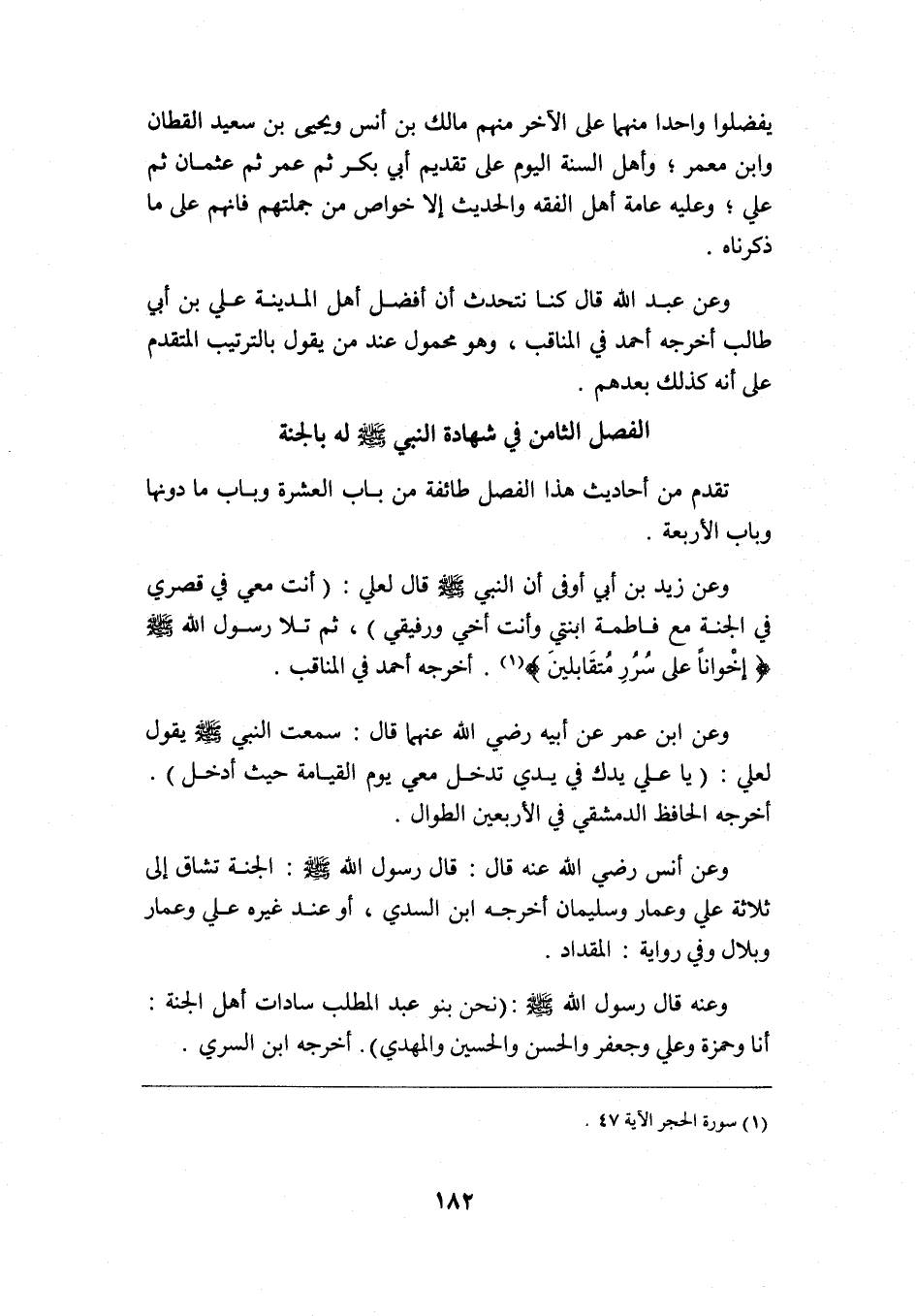وعن زيد بن أبي أوفى أن النبي -صلى الله عليه وسلم- قال لعلي: "أنت معي في قصري في الجنة مع فاطمة ابنتي, وأنت أخي ورفيقي" ثم تلا رسول الله -صلى الله عليه وسلم: {إِخْوَانًا عَلَى سُرُرٍ مُتَقَابِلِينَ} 1. أخرجه أحمد في المناقب.