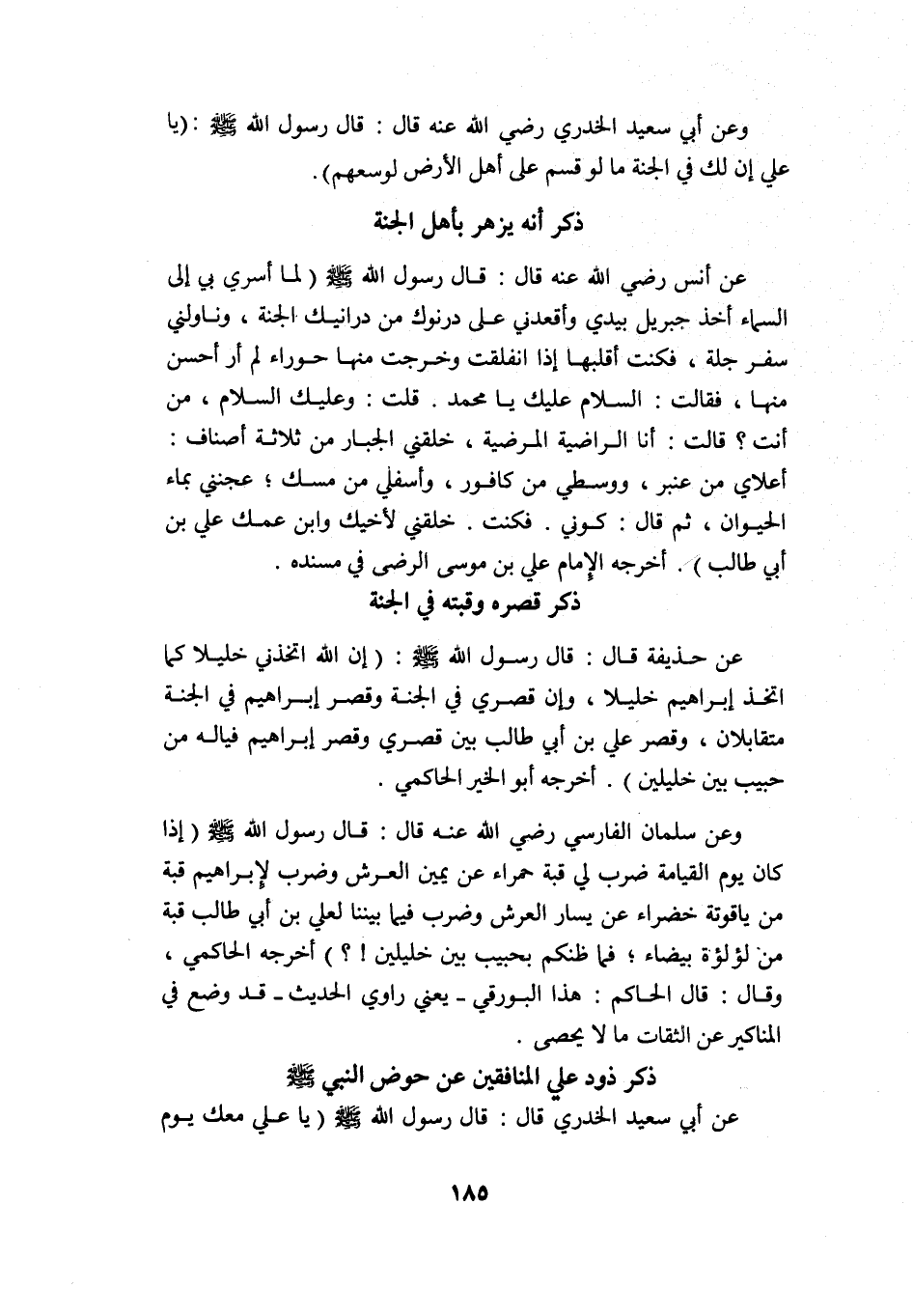 عن أنس -رضي الله عنه- قال: قال رسول الله -صلى الله عليه وسلم: "لما أسري بي إلى السماء, أخذ جبريل بيدي وأقعدني على درنوك من درانيك الجنة، وناولني سفرجلة فكنت أقلبها إذ انفلقت وخرجت منها حوراء لم أر أحسن منها، فقالت: السلام عليك يا محمد, قلت: وعليك السلام، من أنت? قالت: أنا الراضية المرضية، خلقني الجبار من ثلاثة أصناف: أعلاي من عنبر، ووسطي من كافور، وأسفلي من مسك؛ عجنني بماء الحيوان، ثم قال: كوني فكنت, خلقني لأخيك وابن عمك علي بن أبي طالب" أخرجه الإمام علي بن موسى الرضا في مسنده.