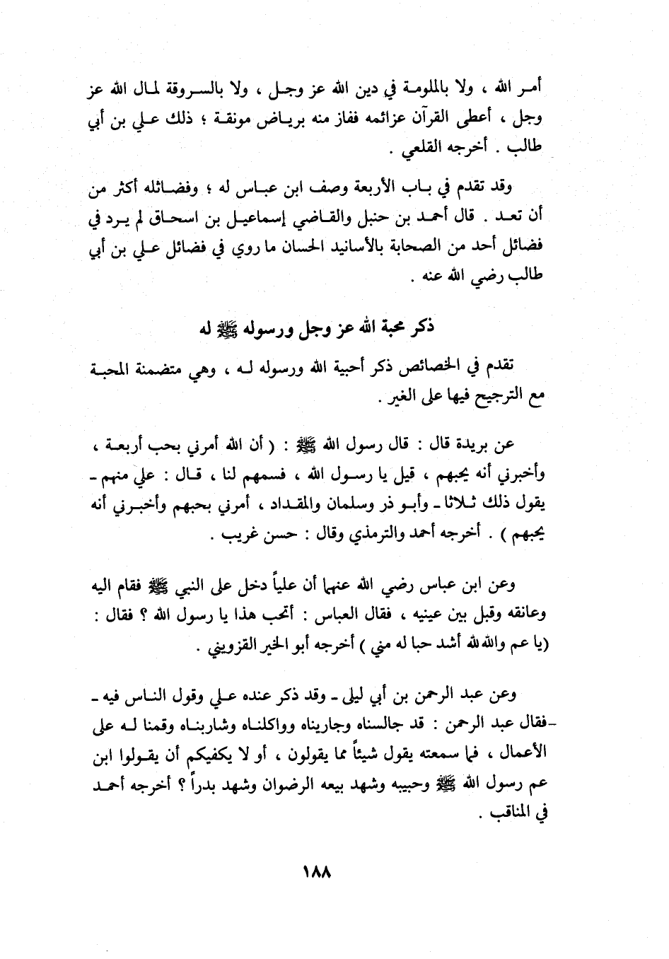 عن بريدة قال: قال رسول الله -صلى الله عليه وسلم: "إن الله أمرني بحب أربعة، وأخبرني أنه يحبهم" قيل يا رسول الله، فسمهم لنا، قال: "علي منهم -يقول ذلك ثلاثًا- وأبو ذر وسلمان والمقداد، أمرني بحبهم وأخبرني أنه يحبهم" أخرجه أحمد والترمذي وقال: حسن غريب.