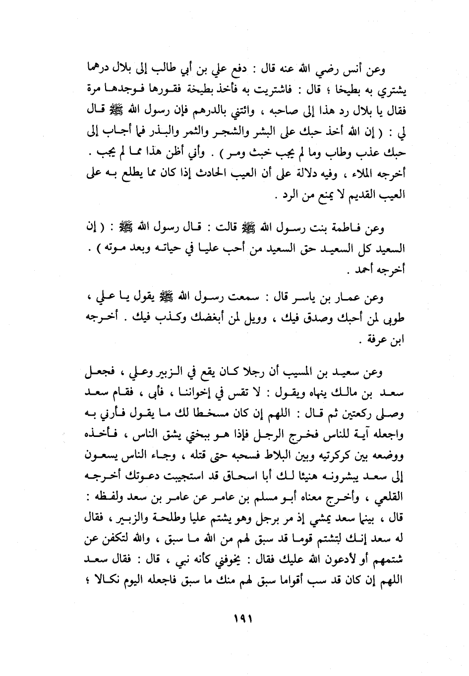 وعن عمار بن ياسر قال: سمعت رسول الله -صلى الله عليه وسلم- يقول: "يا علي، طوبى لمن أحبك وصدق فيك، وويل لمن أبغضك وكذب فيك" أخرجه ابن عرفة.