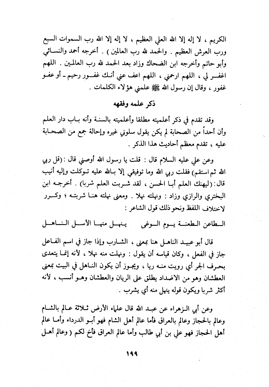 وعن علي عليه السلام قال: قلت: يا رسول الله أوصني, قال: "قل: ربي الله ثم استقم" فقلت: ربي الله وما توفيقي إلا بالله, عليه توكلت وإليه أنيب قال: "ليهنك العلم أبا الحسن، لقد شربت العلم شربا" أخرجه ابن البختري والرازي وزاد: "ونهلته نهلا" ومعنى نهلته هنا: شربته, وكرر لاختلاف اللفظ ونحو ذلك قول الشاعر: