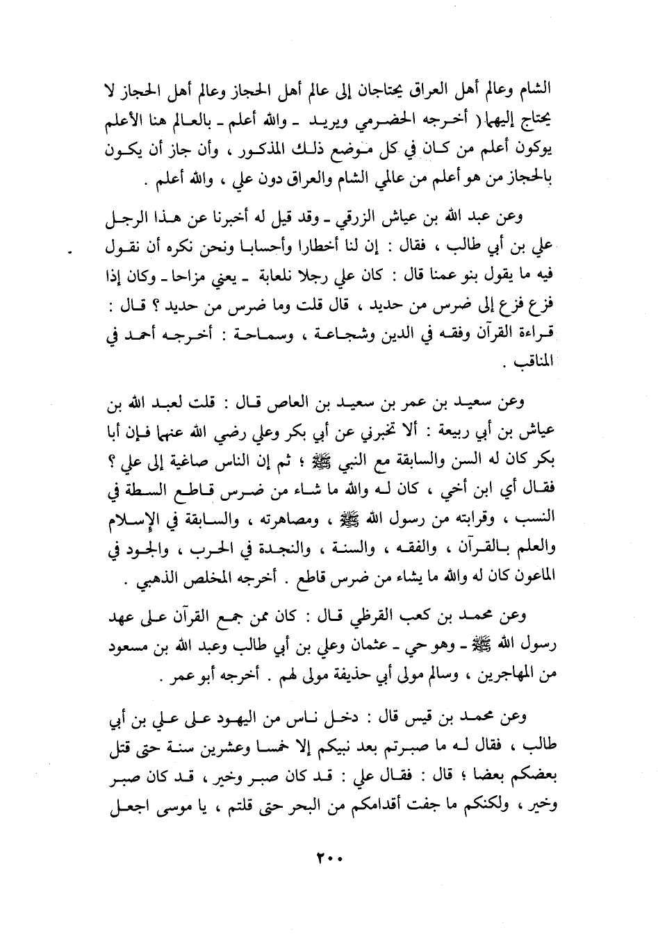 الشام وعالم أهل العراق يحتاجان إلى عالم أهل الحجاز, وعالم أهل الحجاز لا يحتاج إليهما. أخرجه الحضرمي ويريد -والله أعلم- بالعالم هنا الأعلم يكون أعلم من كان في كل موضع ذلك المذكور، وإن جاز أن يكون بالحجاز من هو أعلم من عالمي الشام والعراق دون علي، والله أعلم.