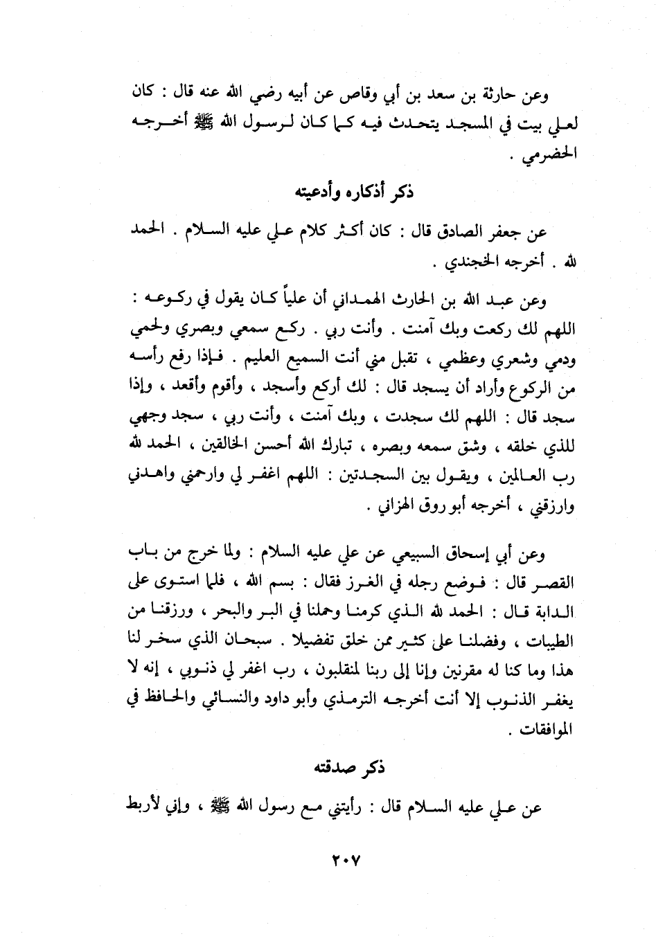 وعن عبد الله بن الحارث الهمداني أن عليا كان يقول في ركوعه: اللهم لك ركعت وبك آمنت وأنت ربي, ركع سمعي وبصري ولحمي ودمي وشعري وعظمي، تقبل مني أنت السميع العليم. فإذا رفع رأسه من الركوع وأراد أن يسجد قال: لك أركع وأسجد، وأقوم وأقعد. وإذا سجد قال: اللهم لك سجدت، وبك آمنت، وأنت ربي، سجد وجهي للذي خلقه وشق سمعه وبصره، تبارك الله أحسن الخالقين، الحمد لله رب العالمين. ويقول بين السجدتين: اللهم اغفر لي وارحمني واهدني وارزقني. أخرجه أبو روق الهزاني.