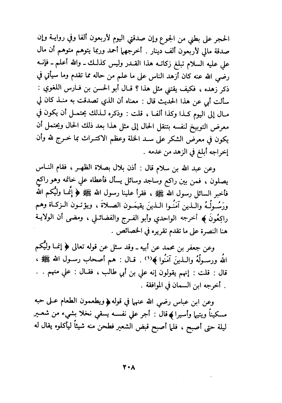 وعن عبد الله بن سلام قال: أذن بلال بصلاة الظهر، فقام الناس يصلون، فمن بين راكع وساجد وسائل يسأل فأعطاه علي خاتمه وهو راكع, فأخبر السائل رسول الله -صلى الله عليه وسلم- فقرأ علينا رسول الله -صلى الله عليه وسلم: {إِنَّمَا وَلِيُّكُمُ اللَّهُ وَرَسُولُهُ وَالَّذِينَ آمَنُوا الَّذِينَ يُقِيمُونَ الصَّلاةَ وَيُؤْتُونَ الزَّكَاةَ وَهُمْ رَاكِعُونَ} أخرجه الواحدي وأبو الفرج والفضائلي، ومضى أن الولاية هنا النصرة على ما تقدم تقريره في الخصائص.