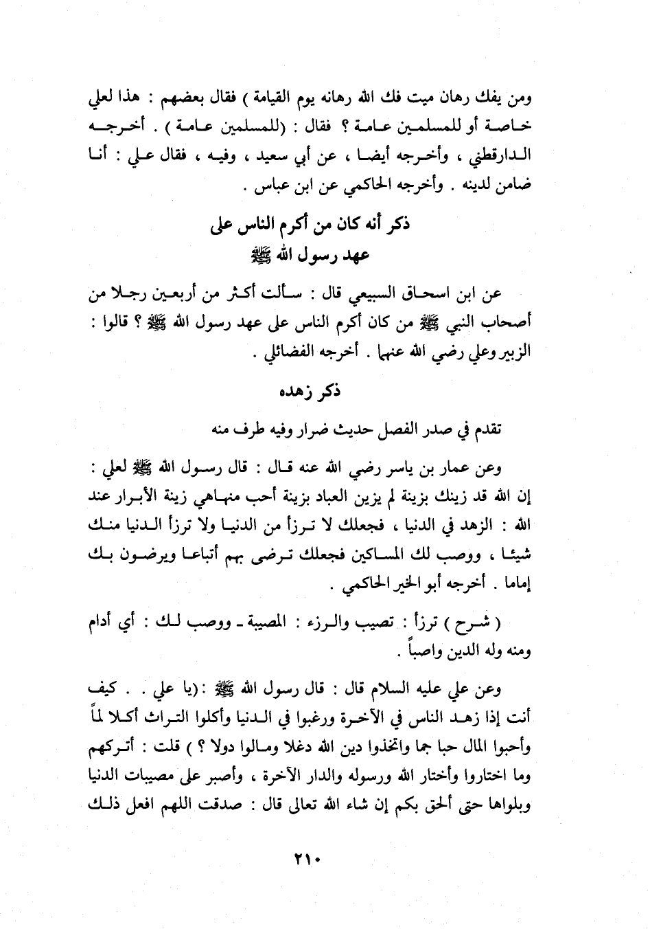 عن أبي إسحاق السبيعي قال: سألت أكثر من أربعين رجلا من أصحاب النبي -صلى الله عليه وسلم: من كان أكرم الناس على عهد رسول الله -صلى الله عليه وسلم? قالوا: الزبير وعلي -رضي الله عنهما. أخرجه الفضائلي.