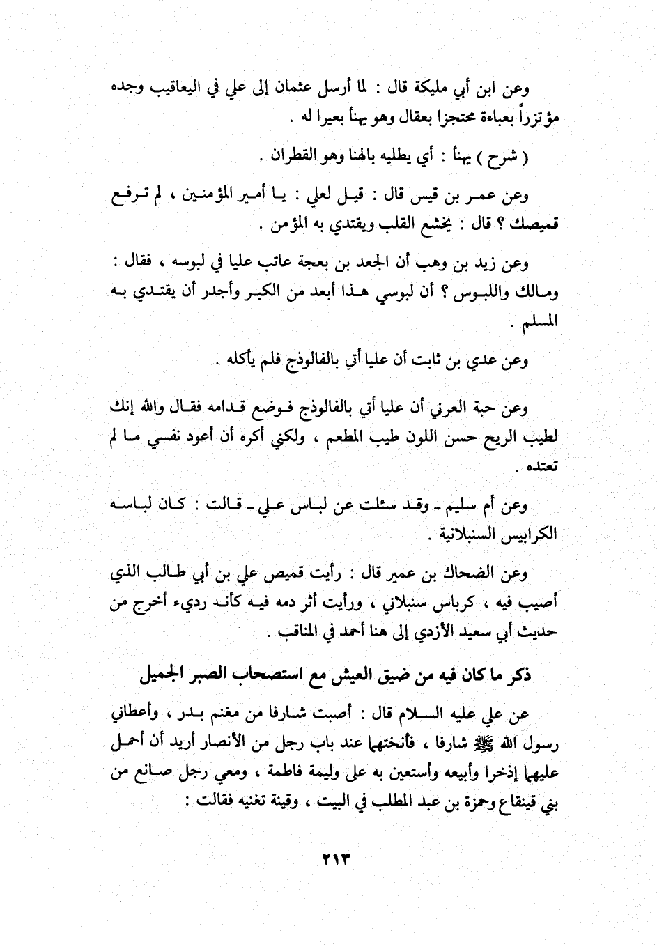 وعن حبة العرني أن عليا أتي بالفالوذج فوضع قدامه, فقال: والله إنك لطيب الريح حسن اللون طيب المطعم، ولكني أكره أن أعوّد نفسي ما لم تعتده.