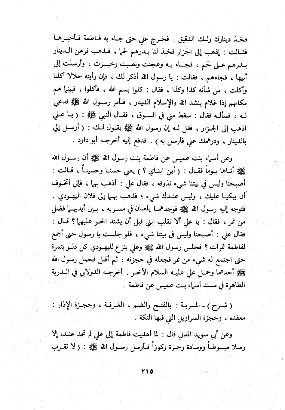 وعن أسماء بنت عميس عن فاطمة بنت رسول الله -صلى الله عليه وسلم- أن رسول الله -صلى الله عليه وسلم- أتاها يومًا فقال: "أين ابناي?" يعني حسنًا وحسينًا، قالت: أصبحنا وليس في بيتنا شيء نذوقه، فقال علي: أذهب بهما، فإني أتخوف أن يبكيا إليك وليس عندك شيء؛ فذهب بهما إلى فلان اليهودي. فتوجه إليه رسول الله -صلى الله عليه وسلم- فوجدهما يلعبان في مسربة، بين أيديهما فضل من تمر، فقال: "يا علي, ألا تقلب ابني قبل أن يشتد الحر عليهما?" قال: فقال علي: أصبحنا وليس في بيتنا شيء، فلو جلست يا رسول الله حتى أجمع لفاطمة تمرات? فجلس رسول الله -صلى الله عليه وسلم- وعلي ينزع لليهودي كل دلو بتمرة حتى اجتمع له شيء من تمر, فجعله في حجزته، ثم أقبل فحمل رسول الله -صلى الله عليه وسلم- أحدهما وحمل علي -عليه السلام- الآخر. أخرجه الدولابي في الذرية الطاهرة في مسند أسماء بنت عميس عن فاطمة.