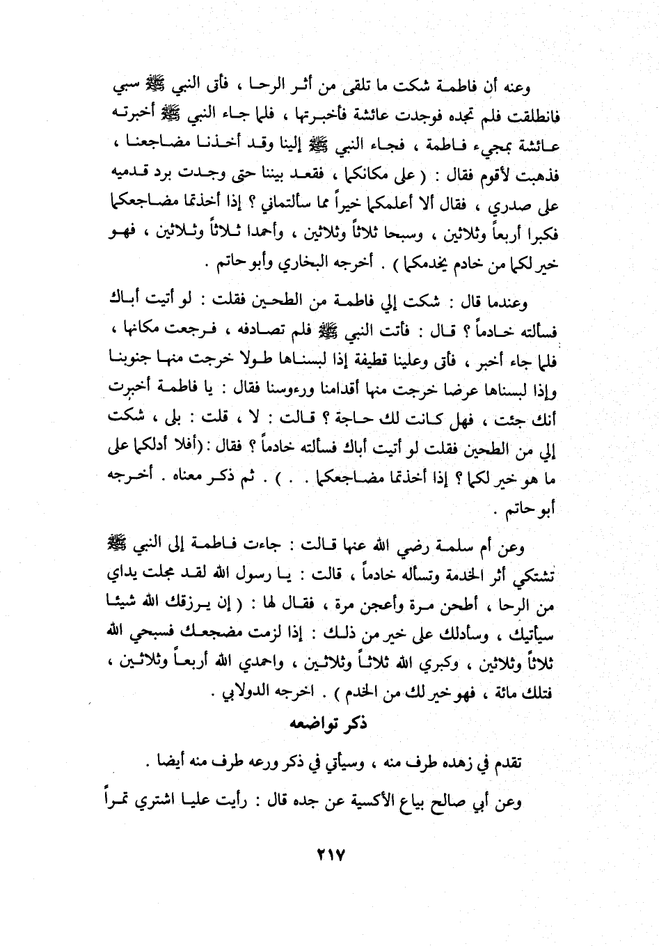 وعنه أن فاطمة شكت ما تلقى من أثر الرحى، فأتى النبي -صلى الله عليه وسلم- سبي فانطلقت فلم تجده, فوجدت عائشة فأخبرتها، فلما جاء النبي -صلى الله عليه وسلم- أخبرته عائشة بمجيء فاطمة، فجاء النبي -صلى الله عليه وسلم- إلينا وقد أخذنا مضاجعنا، فذهبت لأقوم فقال: "على مكانكما" فقعد بيننا حتى وجدت برد قدميه على صدري، فقال: "ألا أعلمكما خيرًا مما سألتماني? إذا أخذتما مضاجعكما فكبرا أربعًا وثلاثين، وسبحا ثلاثًا وثلاثين، واحمدا ثلاثًا وثلاثين، فهو خير لكما من خادم يخدمكما" أخرجه البخاري وأبو حاتم.