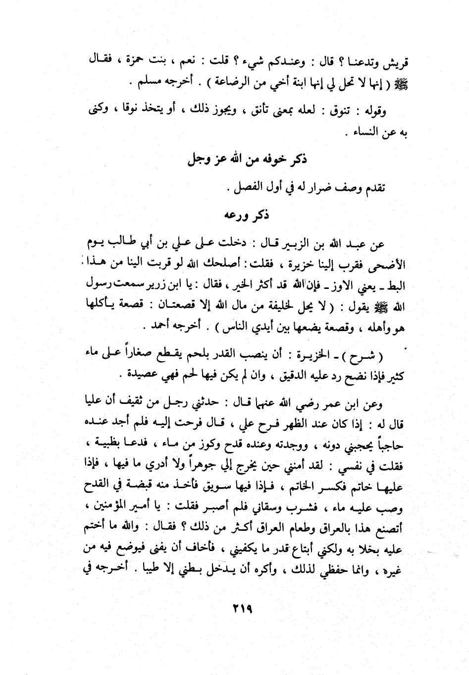 عن عبد الله بن الزبير قال: دخلت على علي بن أبي طالب يوم الأضحى فقرب إلينا خزيرة، فقلت: أصلحك الله لو قربت إلينا من هذا البط -يعني الإوز- فإن الله قد أكثر الخير؟ فقال: يابن زبير سمعت رسول الله -صلى الله عليه وسلم- يقول: "لا يحل لخليفة من مال الله إلا قصعتان: قصعة يأكلها هو وأهله، وقصعة يضعها بين أيدي الناس" أخرجه أحمد.